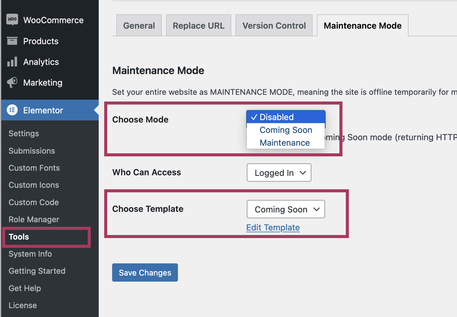 After creating your desired Coming Soon template, navigate to Elementor > Tools and click on the Maintenance Mode tab.