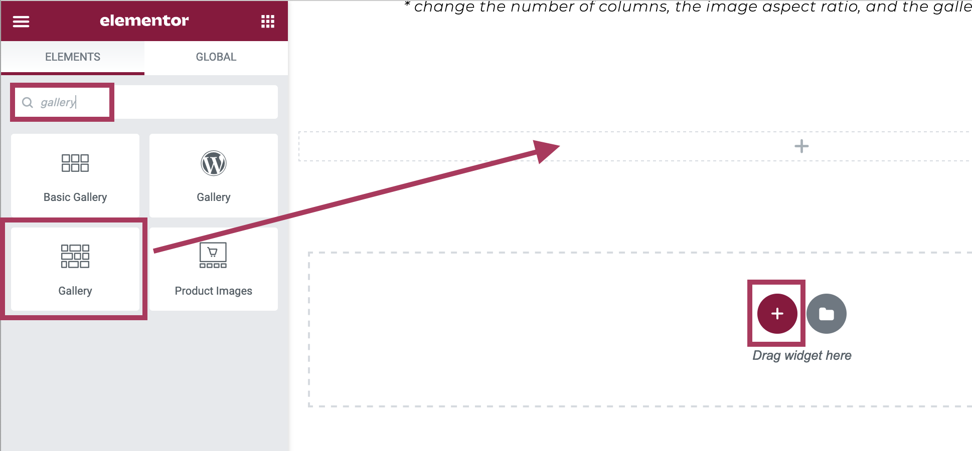 As shown in the screenshot below, drag and drop the Gallery widget into the new section.