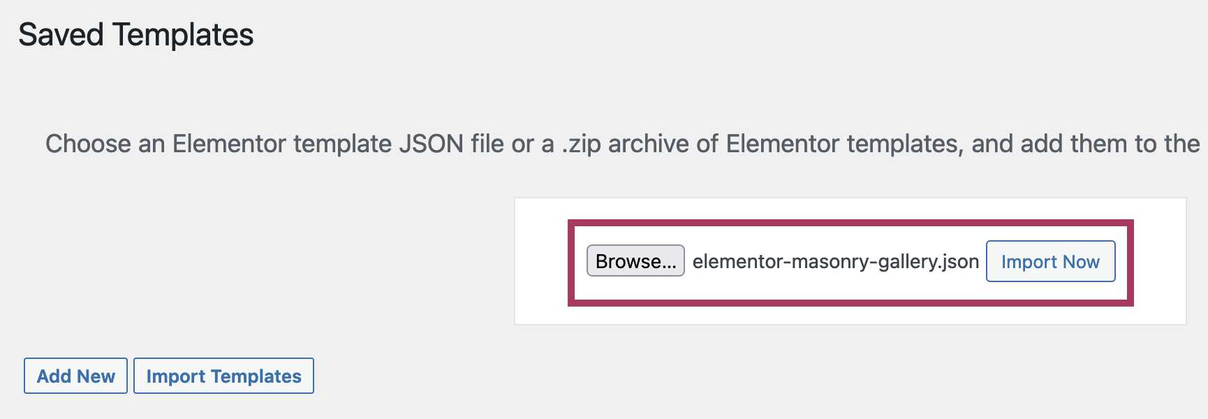 To add the theme gallery templates to your website, go to Templates > Saved Templates. Click the Import Templates button at the top of the screen. On the next screen, browse to select one of the gallery json files from your local computer. Click Import Now to add the gallery template.
