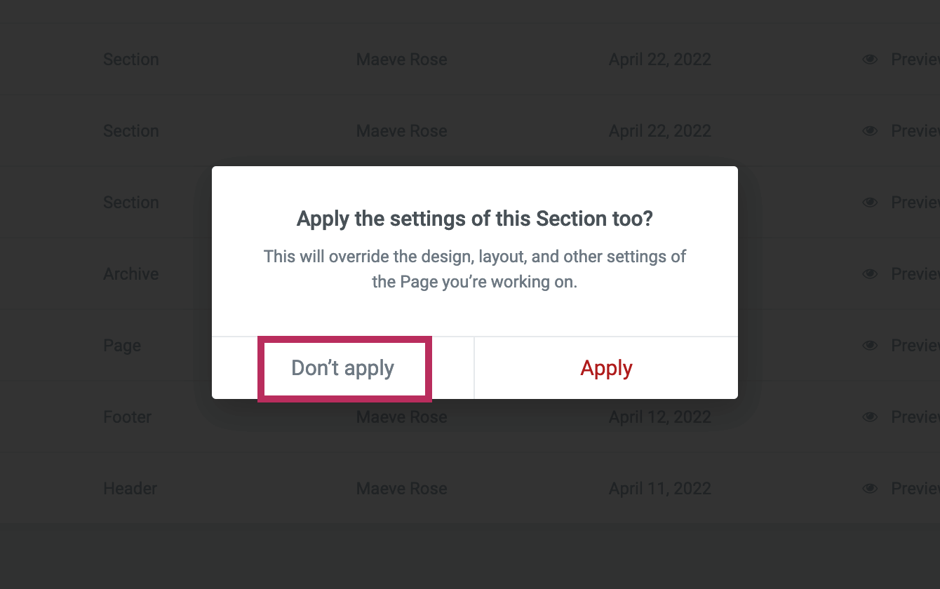 After clicking the Insert button, you will see the Apply the settings of this Section too? pop-up screen as shown in the screenshot below. Make sure you click "Don't apply" when inserting new templates into your page.