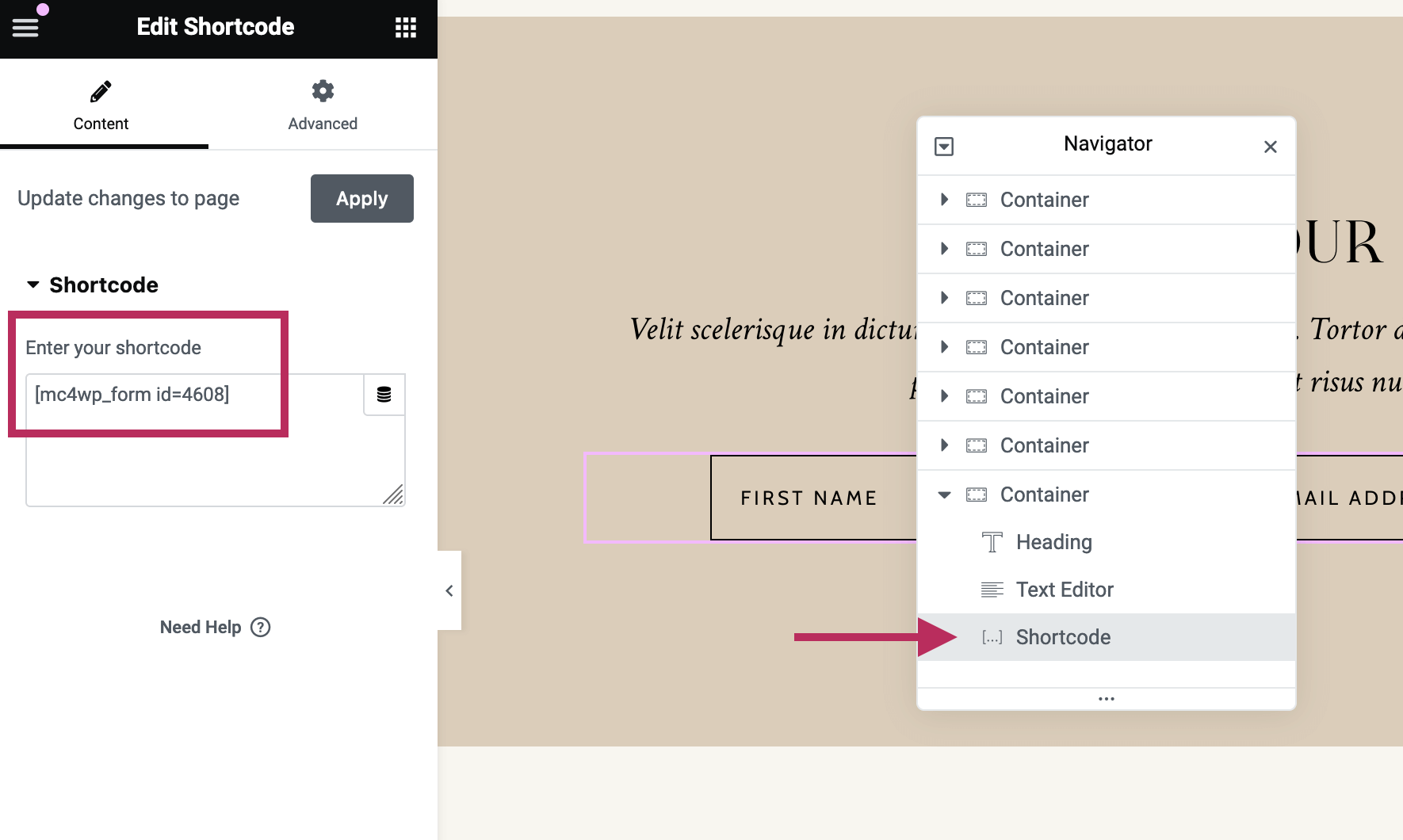 After creating a form, add the subscription form to any Elementor page or template using the Elementor shortcode widget. Ensure that the shortcode from the MailChimp for WordPress plugin is entered into the Elementor widget settings. As shown in the settings below, the form has an ID of 4608, and the shortcode has been copied into the Elementor settings.