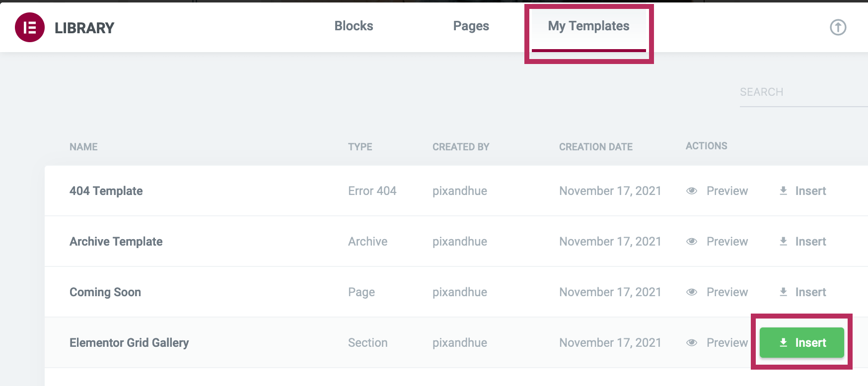 In the pop-up screen, click on My Templates to view all templates you have saved to your website. Click the Insert button to add the template to your page.