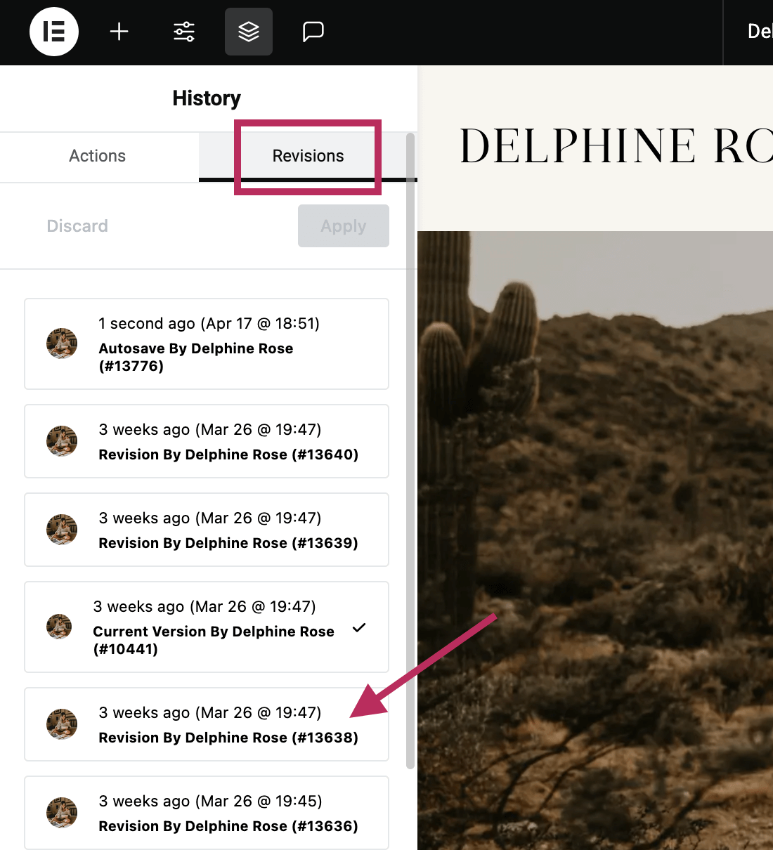 Revisions are every version of the page that you have previously Published. So as you are editing, each time you click Publish, it saves that version of the page to the Revisions tab. Therefore, it's great to regularly click "Publish" as you are editing. If you click on any of the Revisions, Elementor will go back in time to that version of the published page.