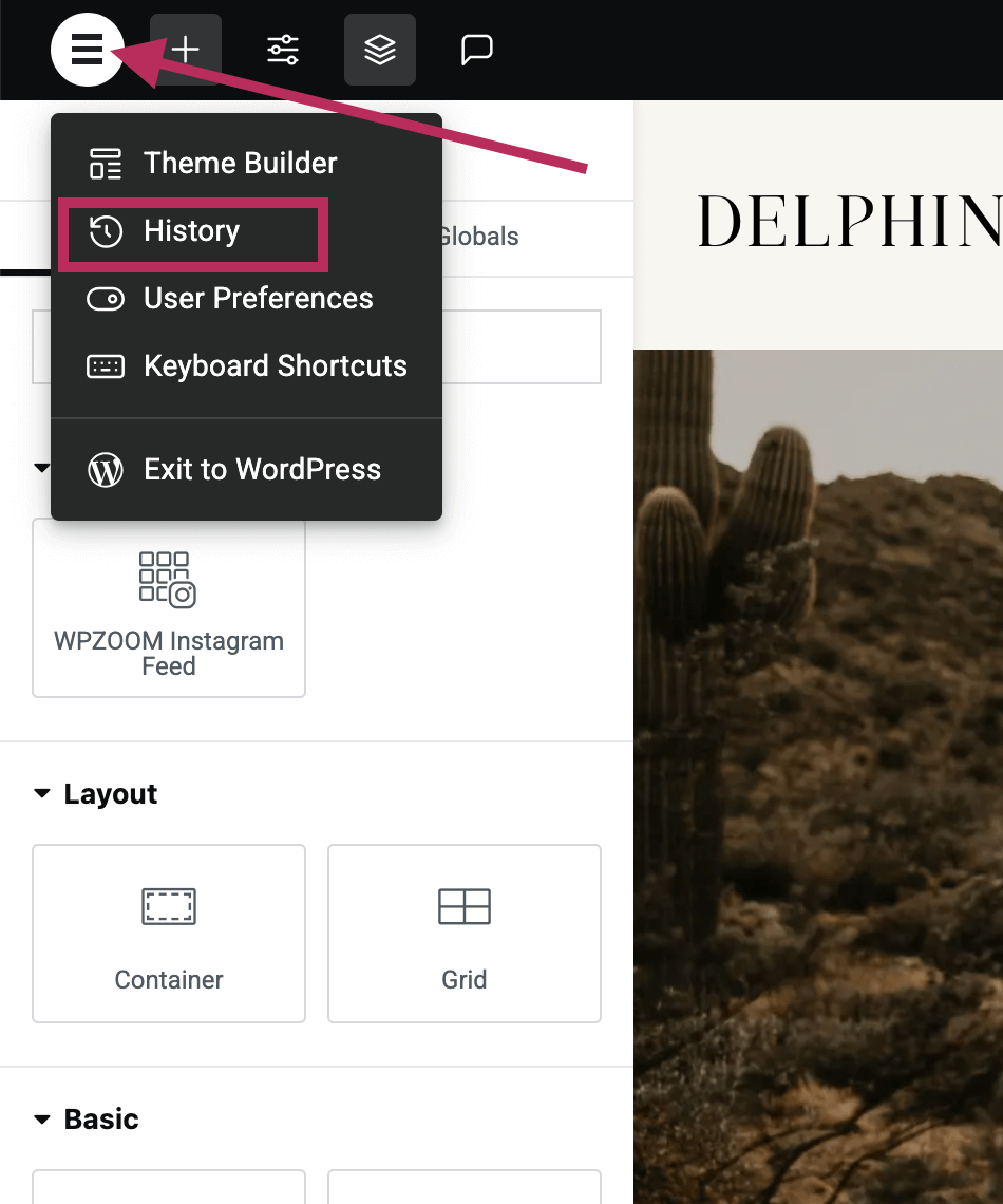 To access the History settings, click on the Elementor icon in the top, left of the screen. In the drop-down menu, click on History.
