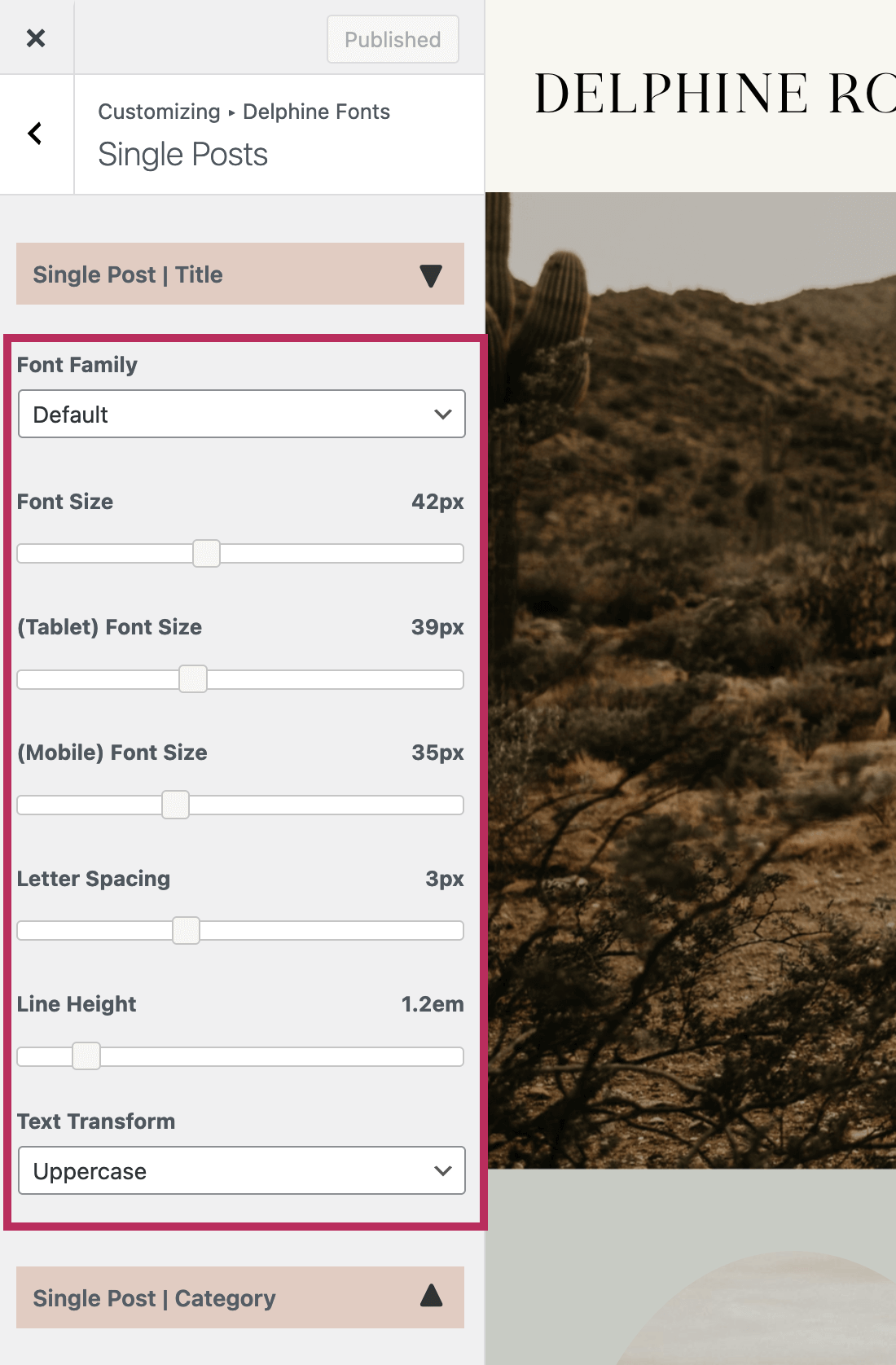 There are some areas of the website that are created outside Elementor, including the Single Post, Sidebar, and Subscription Forms. To make changes to the font styles of these non-Elementor areas, go to Appearance > Customize > Delphine Fonts.