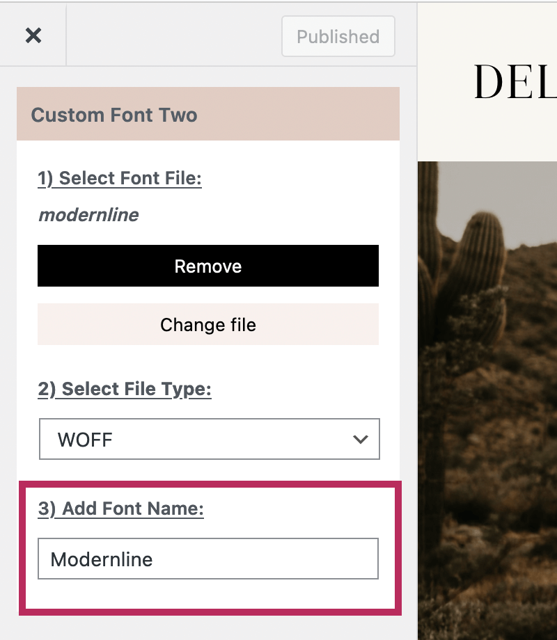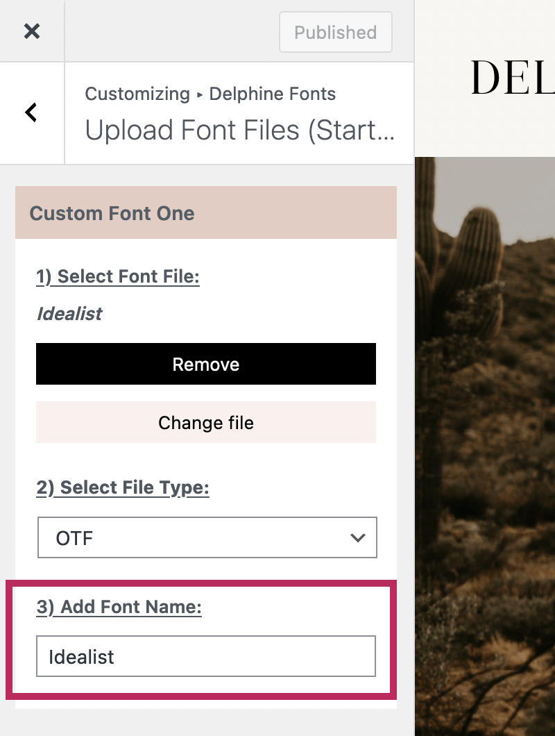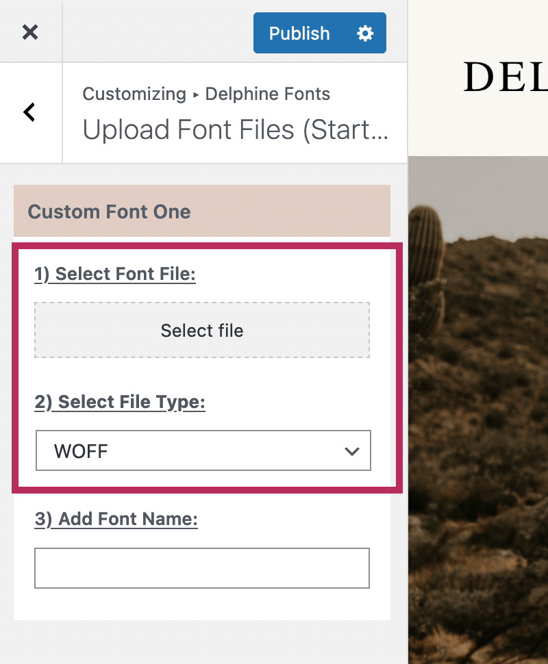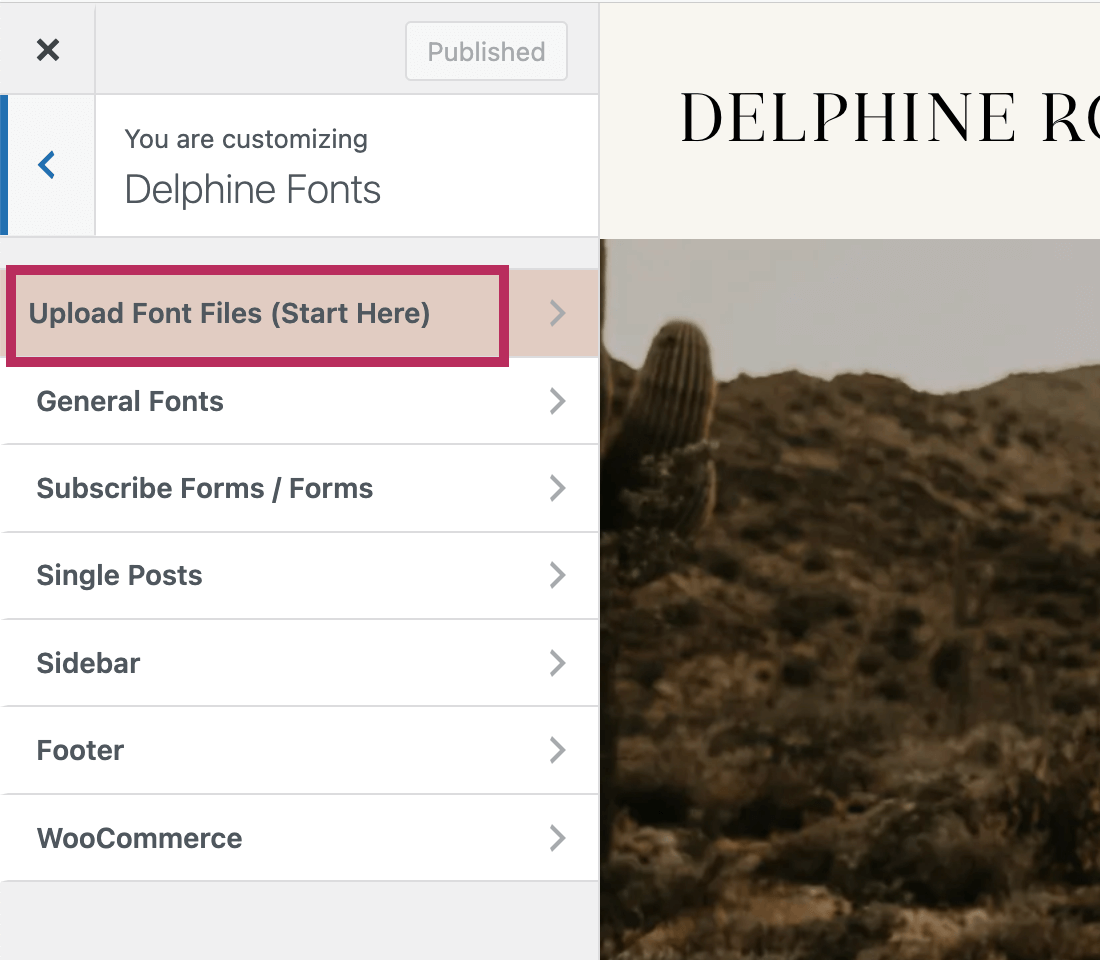 To begin, navigate to Appearance > Customize and click on the Delphine Fonts section. To upload your font files, click on the Upload Font Files (Start Here) section.