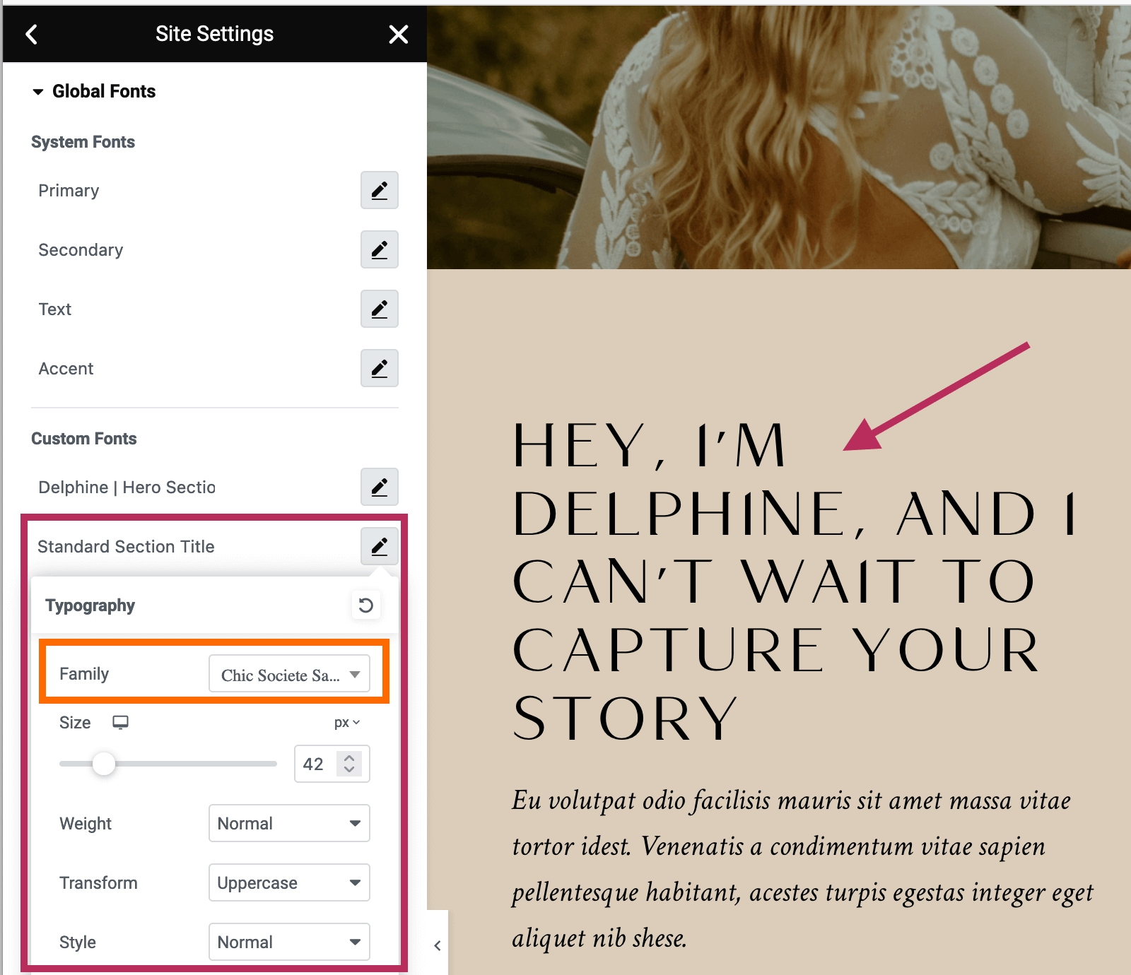 For example, as shown in the screenshot below, if you update the font family of the Standard Section Title, it will update the style of the section headings across all theme pages and templates.
