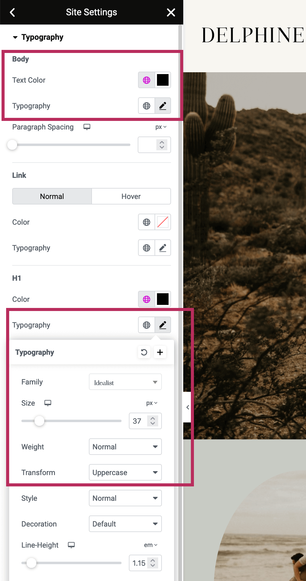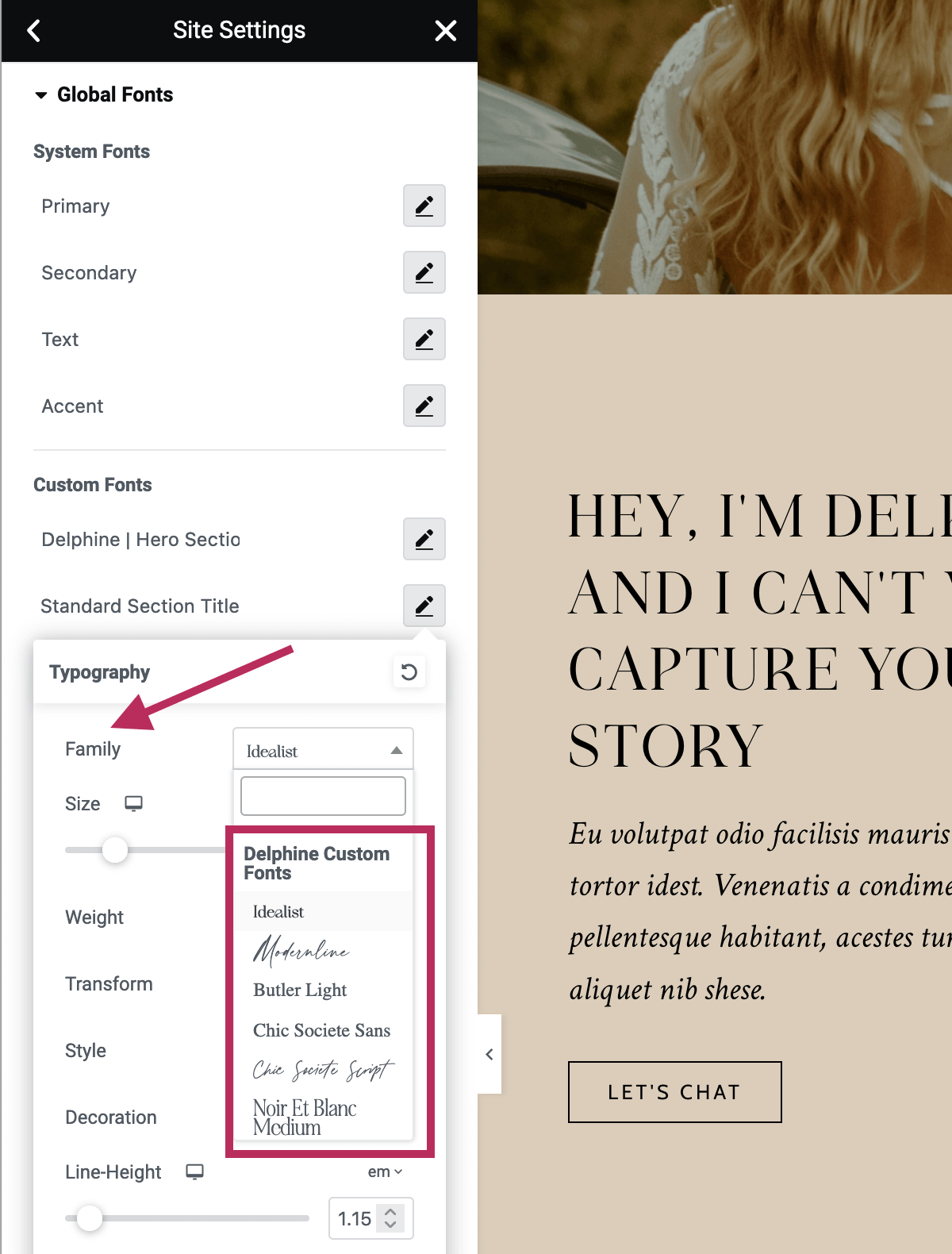 To customize the font styles of text elements that are specific to the Delphine theme, navigate back in the Site Settings menu and click on the Global Fonts tab. Each item in the list corresponds to text within the Delphine theme pages. Changes made within this settings menu will be applied throughout all pages and templates of the Delphine theme.