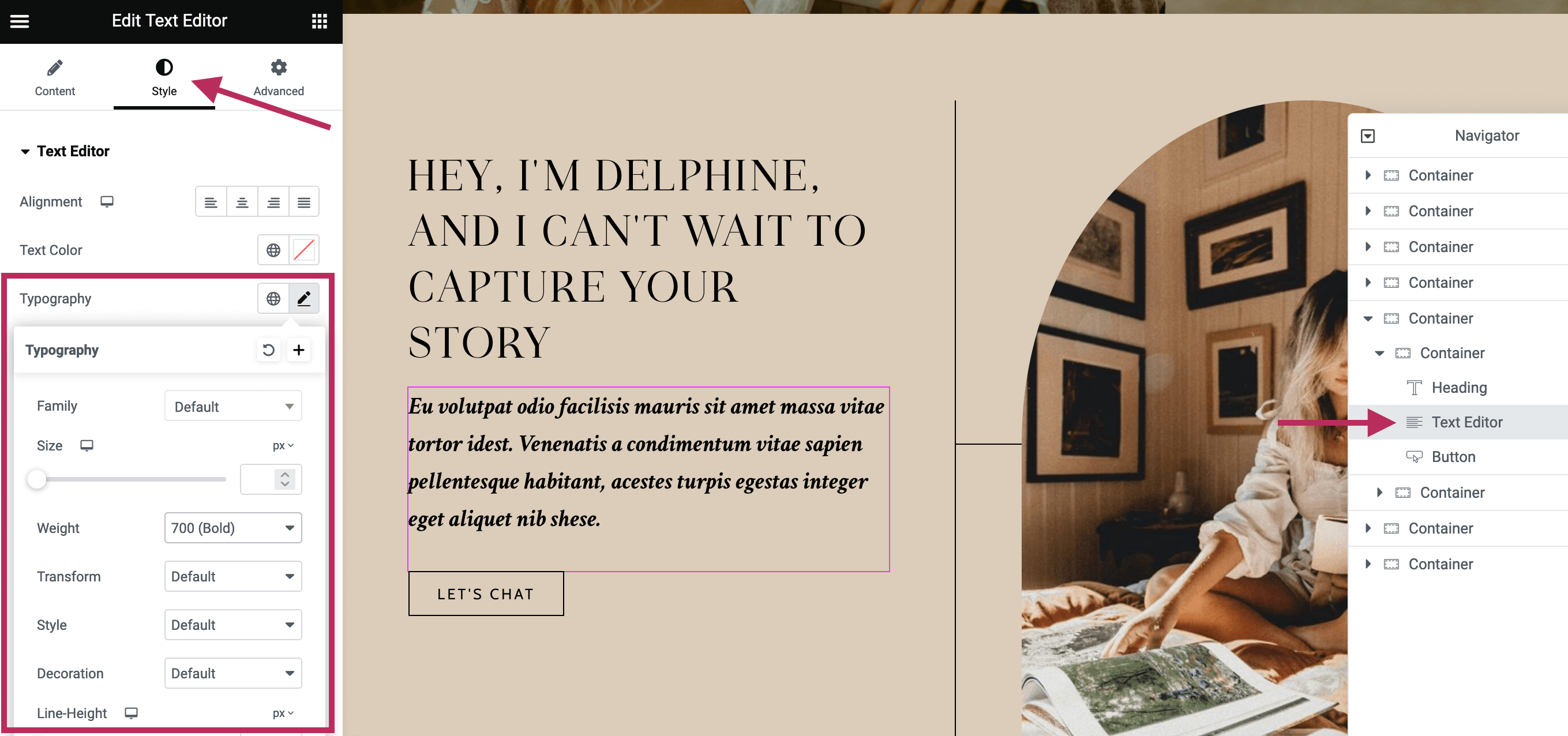 For example, as shown in the screenshot below, I have selected an individual text editor within the Navigator. I have updated the font weight to 700 to create bold text. Using the individual Style settings will add the unique style to this paragraph, only.