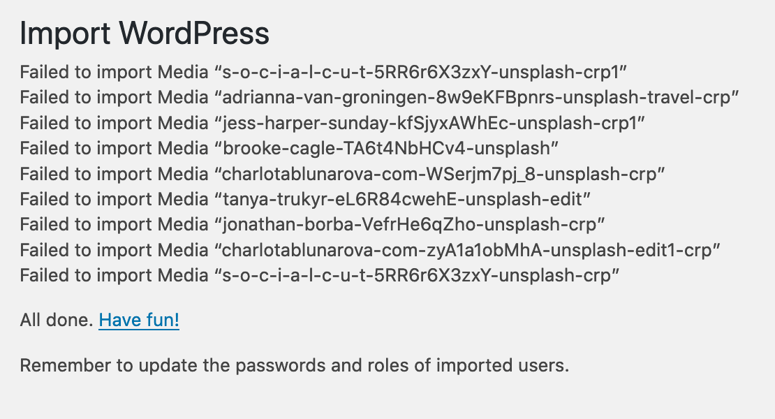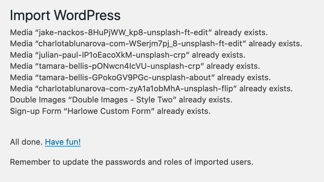 You may also see notifications like the screenshot below that certain items already exist on your site. WordPress will only import the same asset (such as image file) one time. It will not import duplicates of the same item. If you have already imported other demo files, you may see this notification. You can ignore these messages, your file was sucessfully imported.