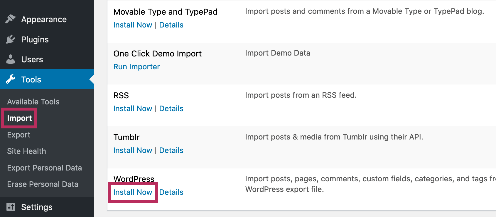 As shown in the screenshot below, if this your first time using the WordPress Importer plugin, click the Install Now link listed under WordPress in the listed tools.