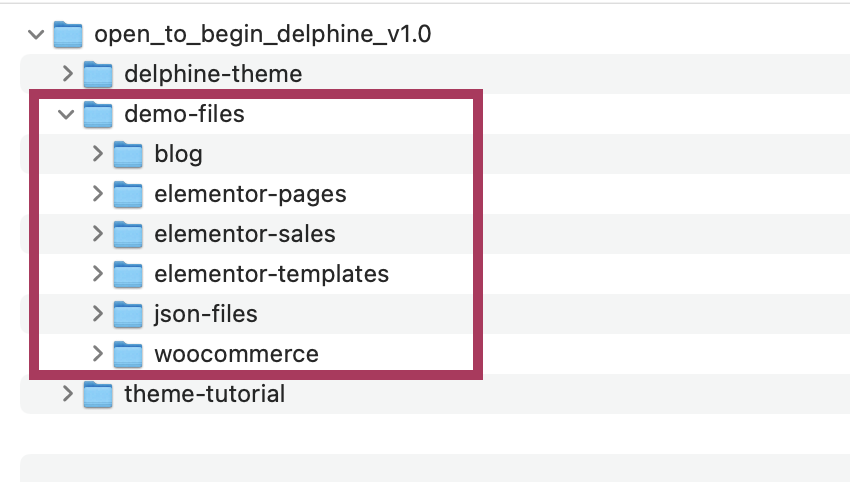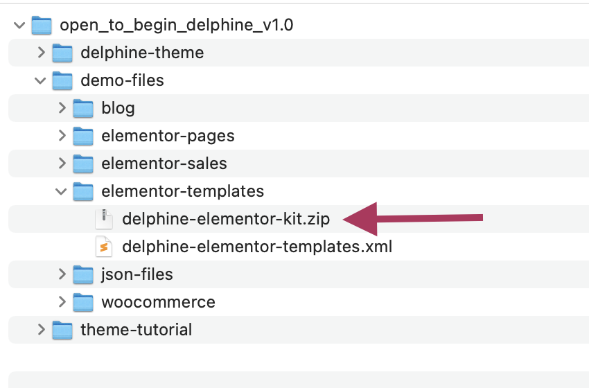 Navigate to the main purchase file (open_to_begin_delphine) that came with your purchase. Under the /demo-files folder, you will find the XML and JSON files that can be used to manually import Elementor pages and templates onto your site.