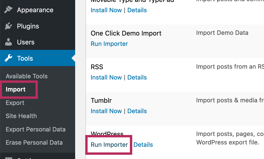 To manually import the demo files, the recommended plugin is the WordPress Importer plugin. From the WordPress Dashboard, navigate to Tools > Import.