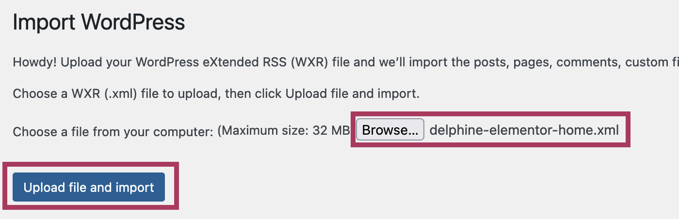 On the next screen, click the Browse button to select the preferred demo XML file from your local computer. All of the theme demo XML files are included in the main zip file, within the /demo-files folder.