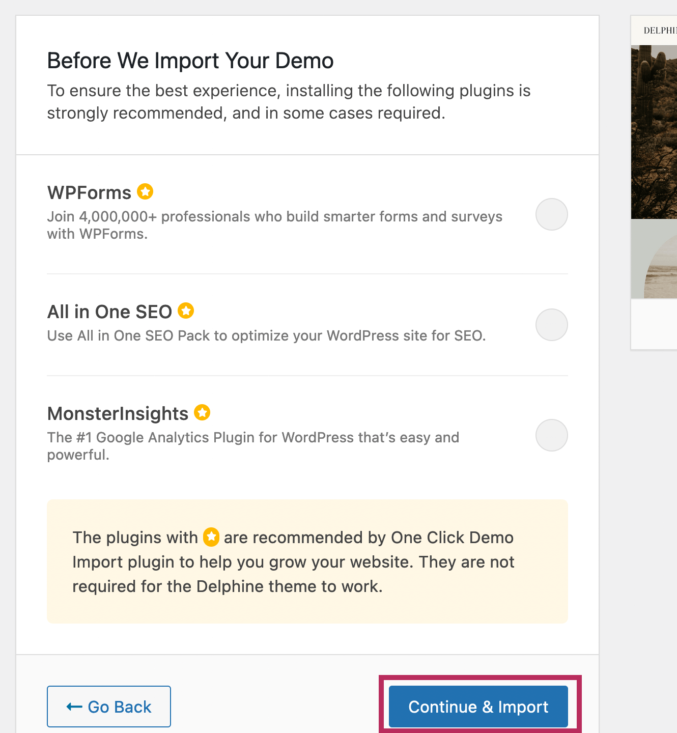 You can ignore the prompt to download more plugins onto your website. Simply click the blue Continue & Import to add the demo content to your site.