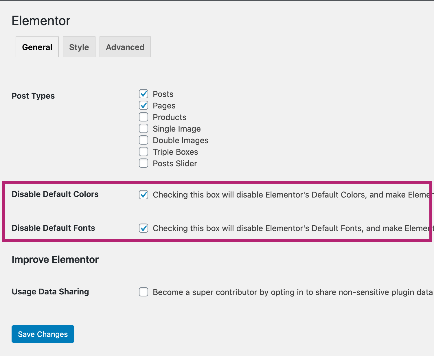 By default, Elementor adds its own font and color selections, which are different from the custom styles that are packaged with the theme. Therefore, it is best to disable the default Elementor fonts and colors before customizing your website.
