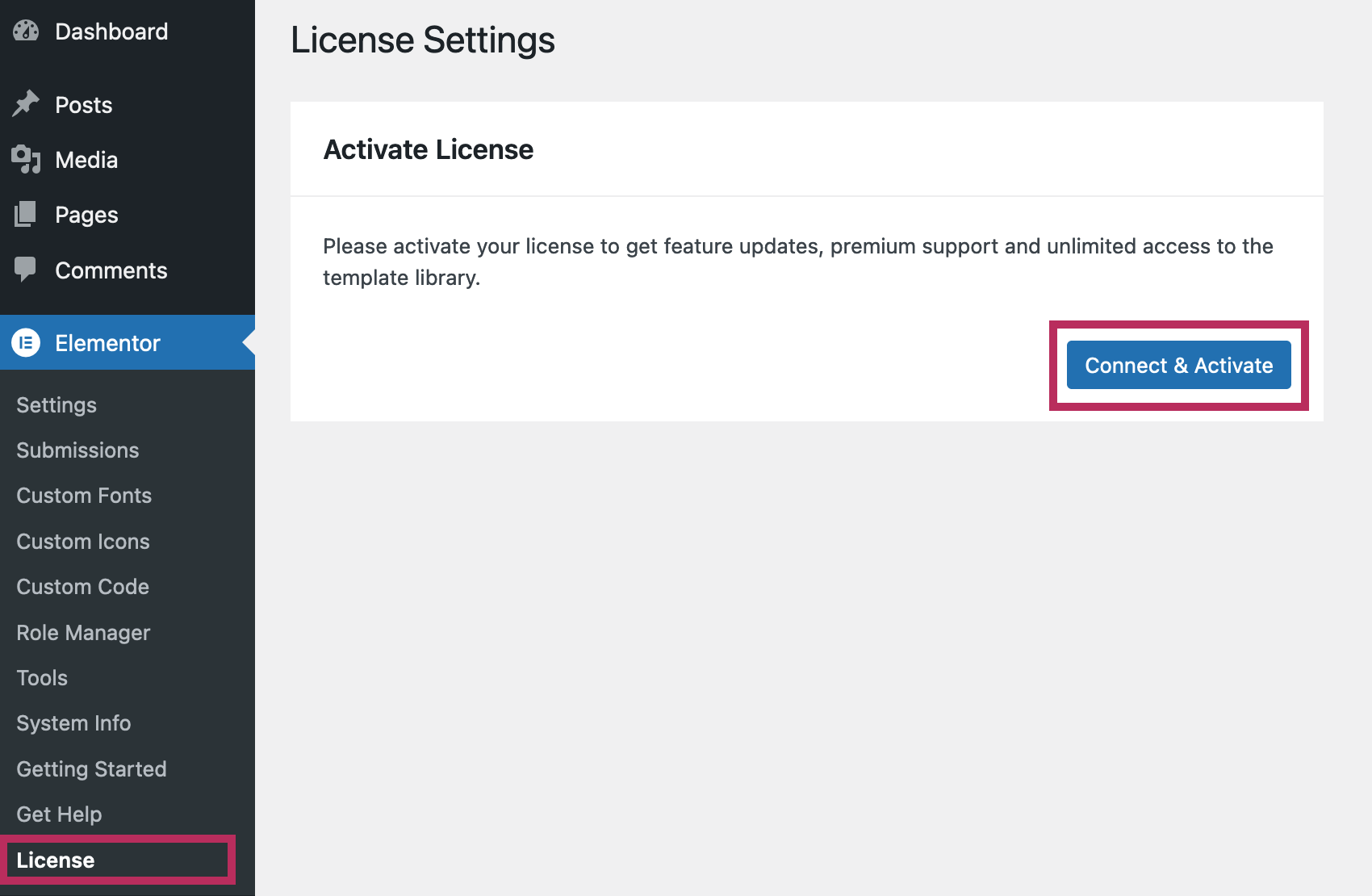 Once the Elementor Pro plugin is active, please navigate to Elementor > License to connect your website to your Elementor Pro account. As shown in the screenshot below, click Connect & Activate. Follow the instructions to activate your license.