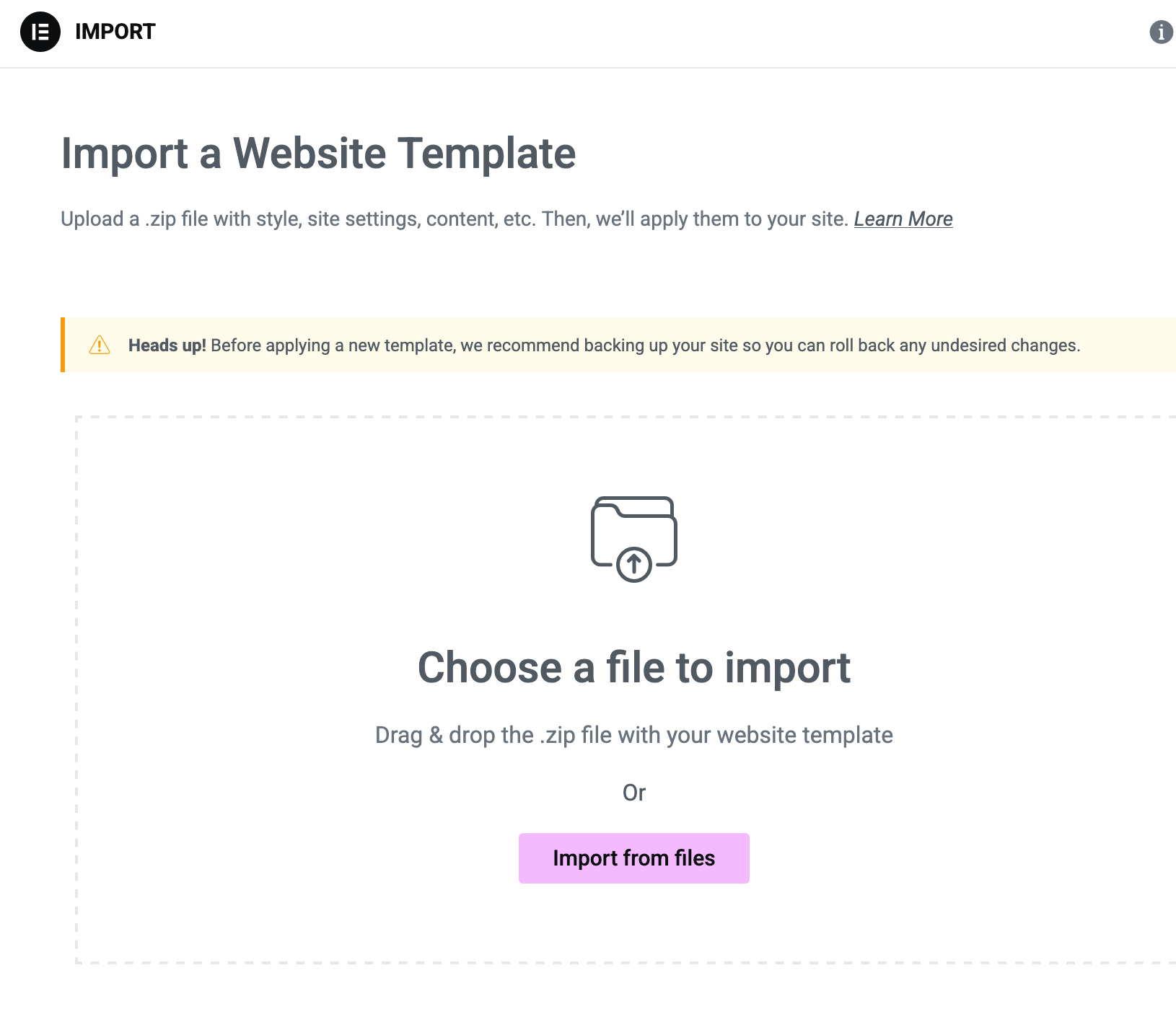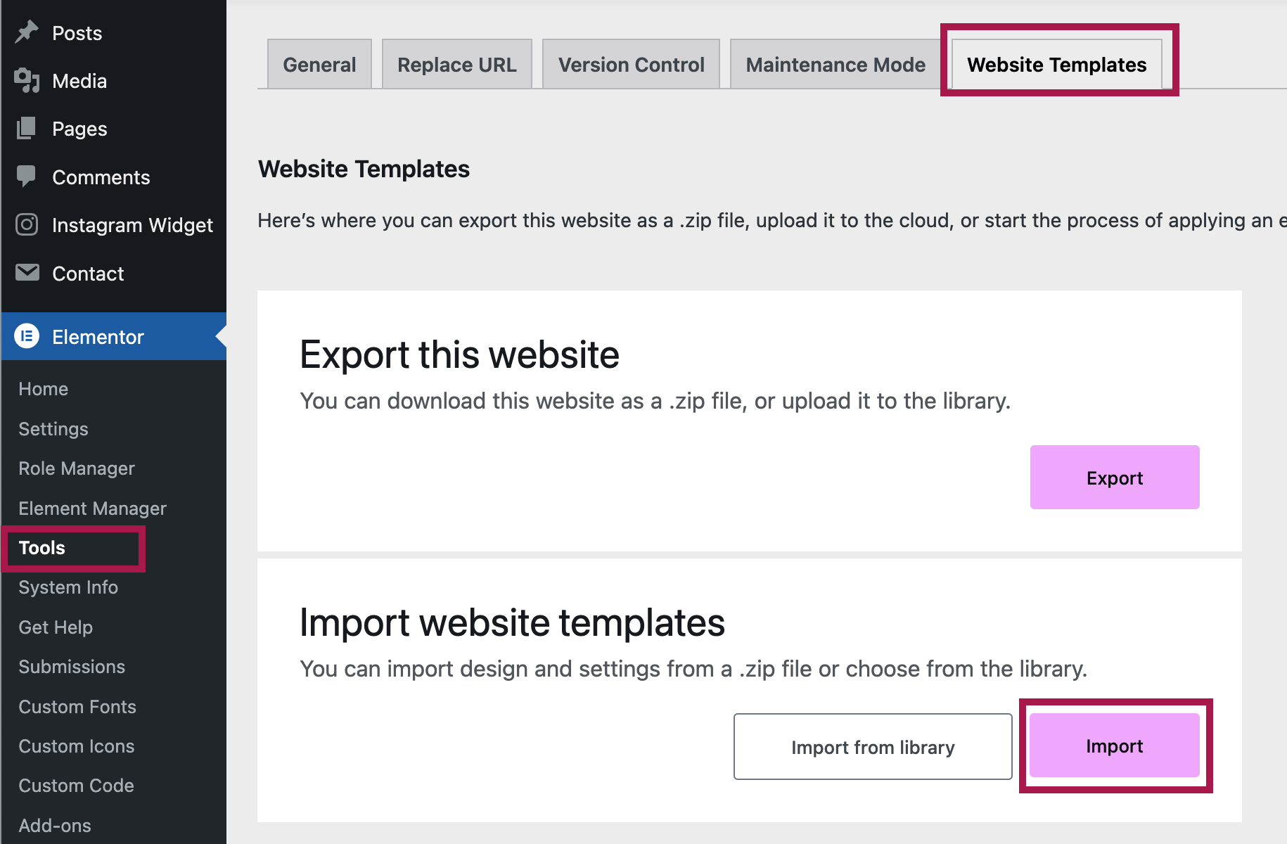 To upload the global Elementor settings for the theme, navigate to Elementor > Tools and click on the Website Templates tab. Under Import website templates, click on the Import button to continue with the import.