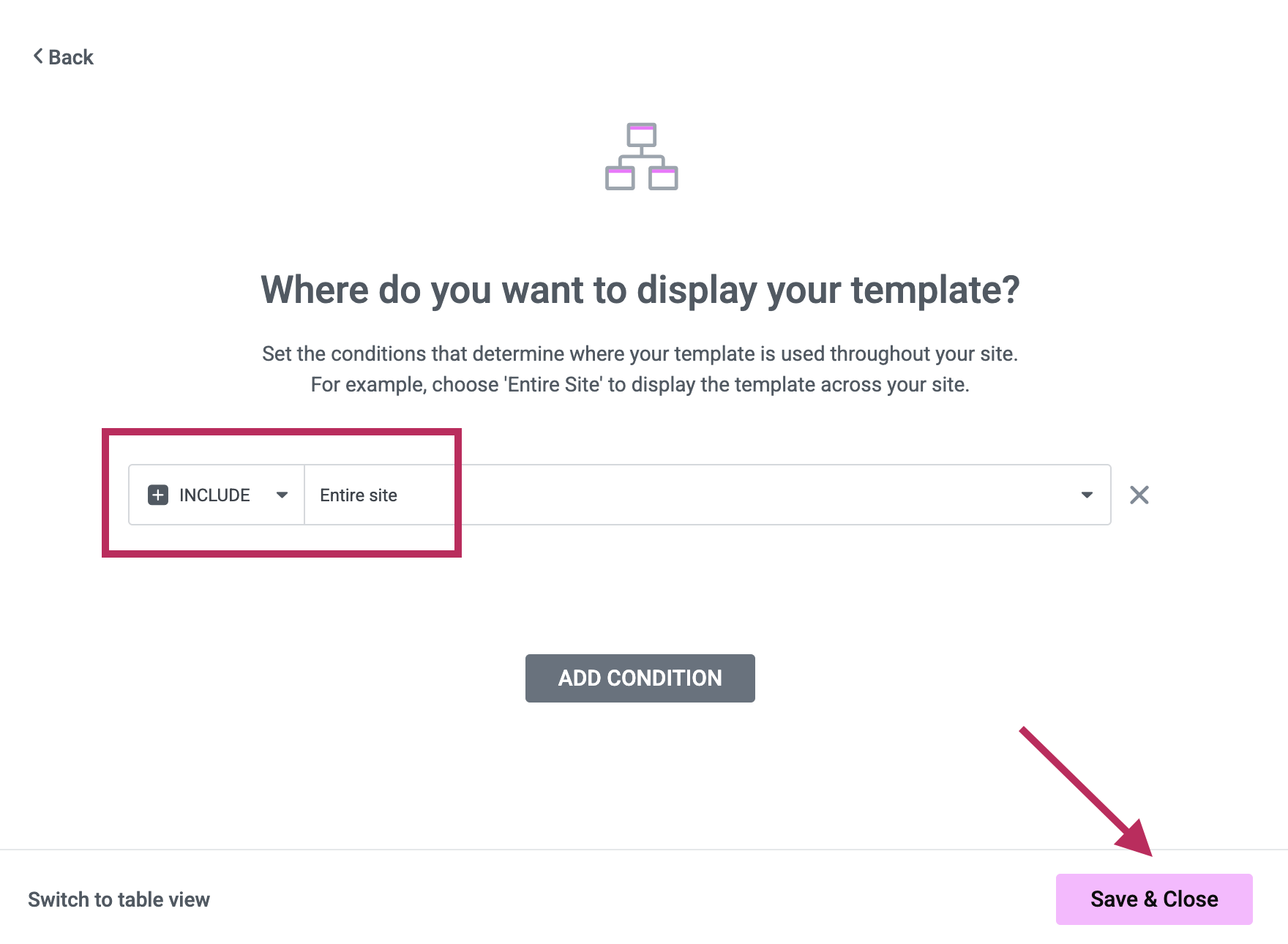 Confirm that the Header Template is set to display on the Entire Site. Finally, click the purple Save and Close button to finalize the import of the initial Elementor templates.