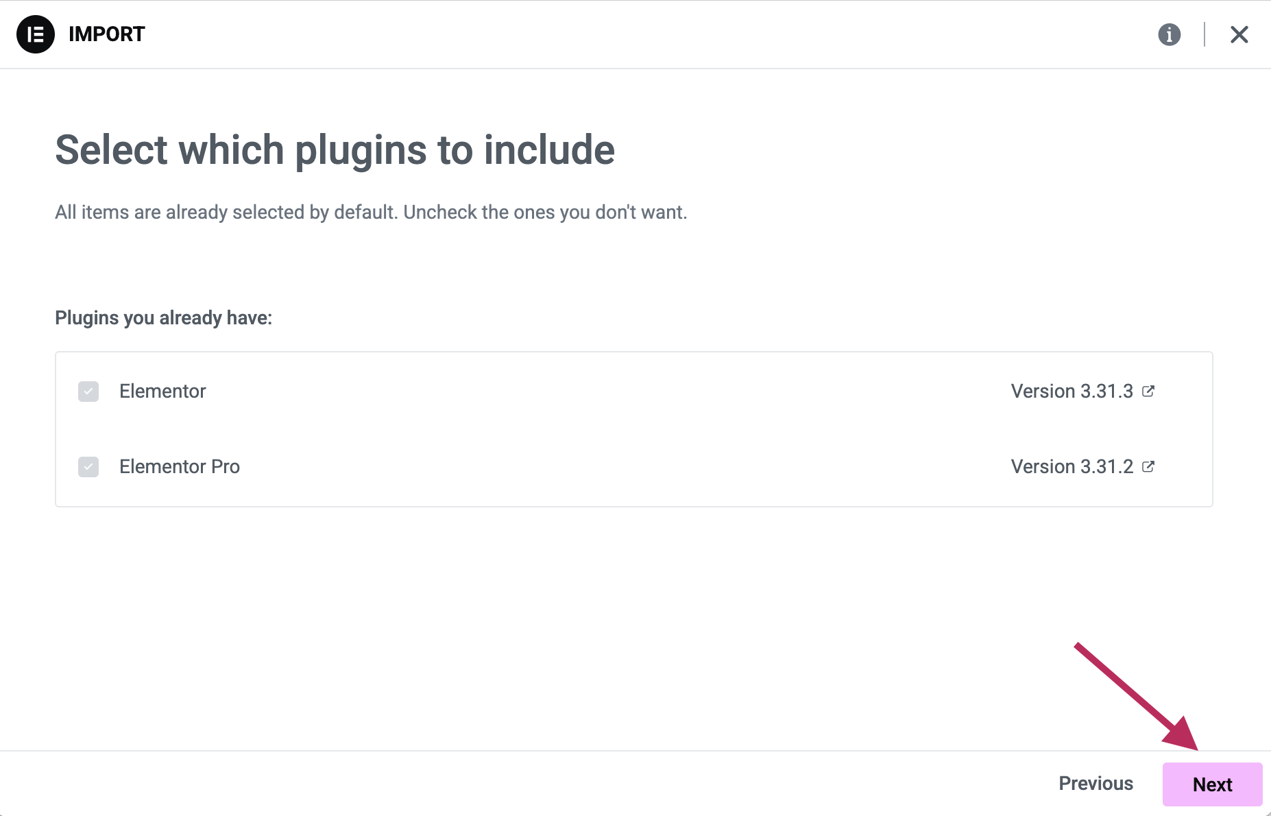 On the next screen, it will confirm that you already have the Elementor plugin and the Elementor Pro plugin installed on your website. Before moving forward, please make sure you have all of the plugins (listed in the Plugin section of the theme tutorial) activated on your website.
