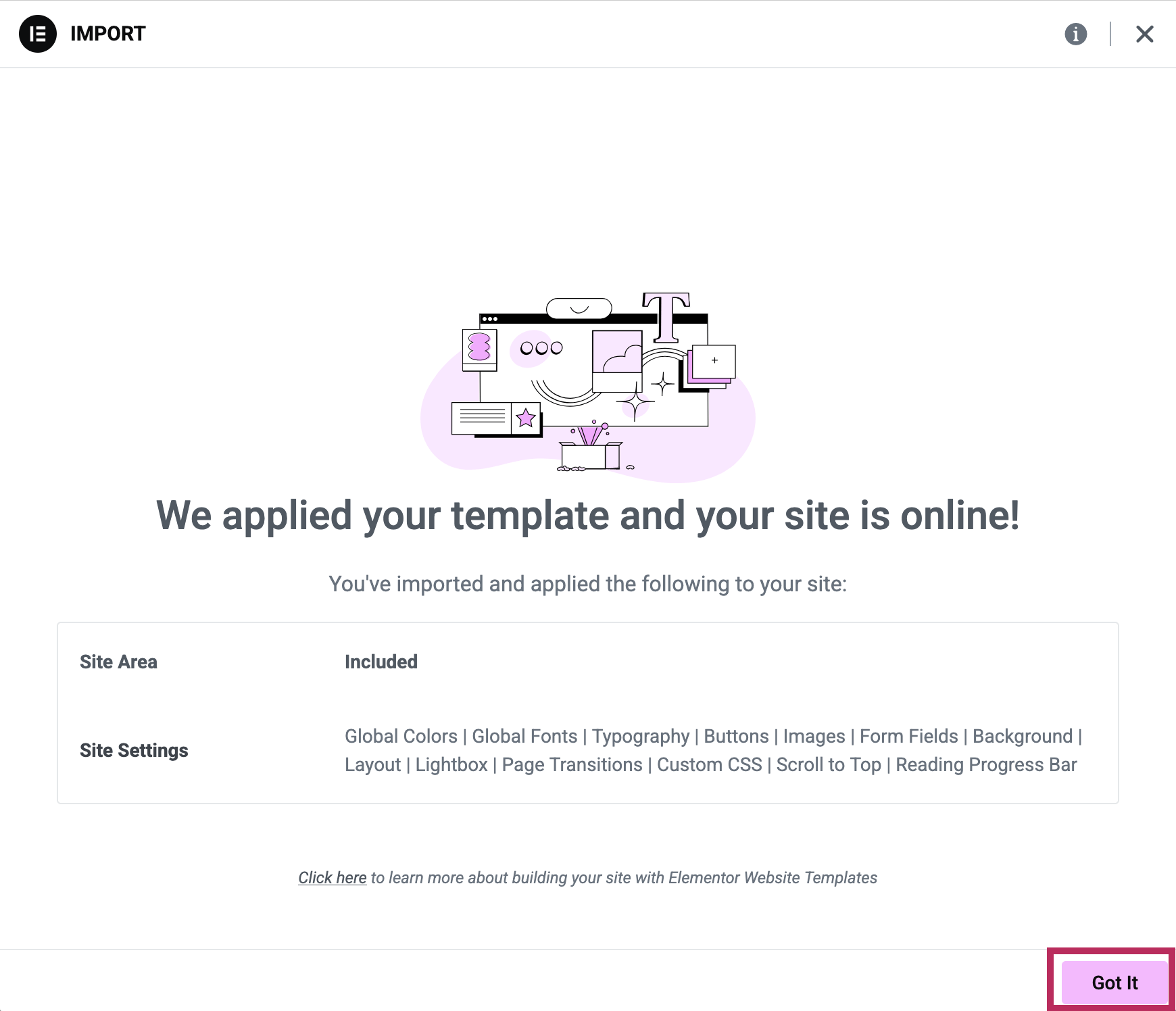 On the final screen, you will see a success message that the Elementor kit has been successfully added to your site. You can click Got it to exit out of the Import Kit screen.