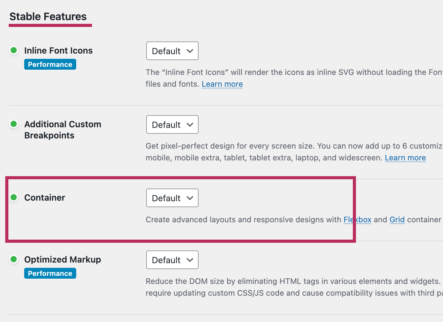 Please go to Elementor > Settings and click on the Features tab. Scroll down to the Stable Features seciton.