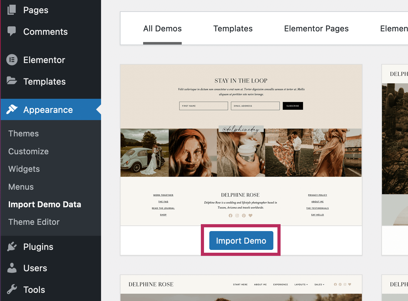 To import the demo content onto your site, navigate to Appearance > Import Demo Data. Hover over a thumbnail icon, and click the blue "Import Demo" button.