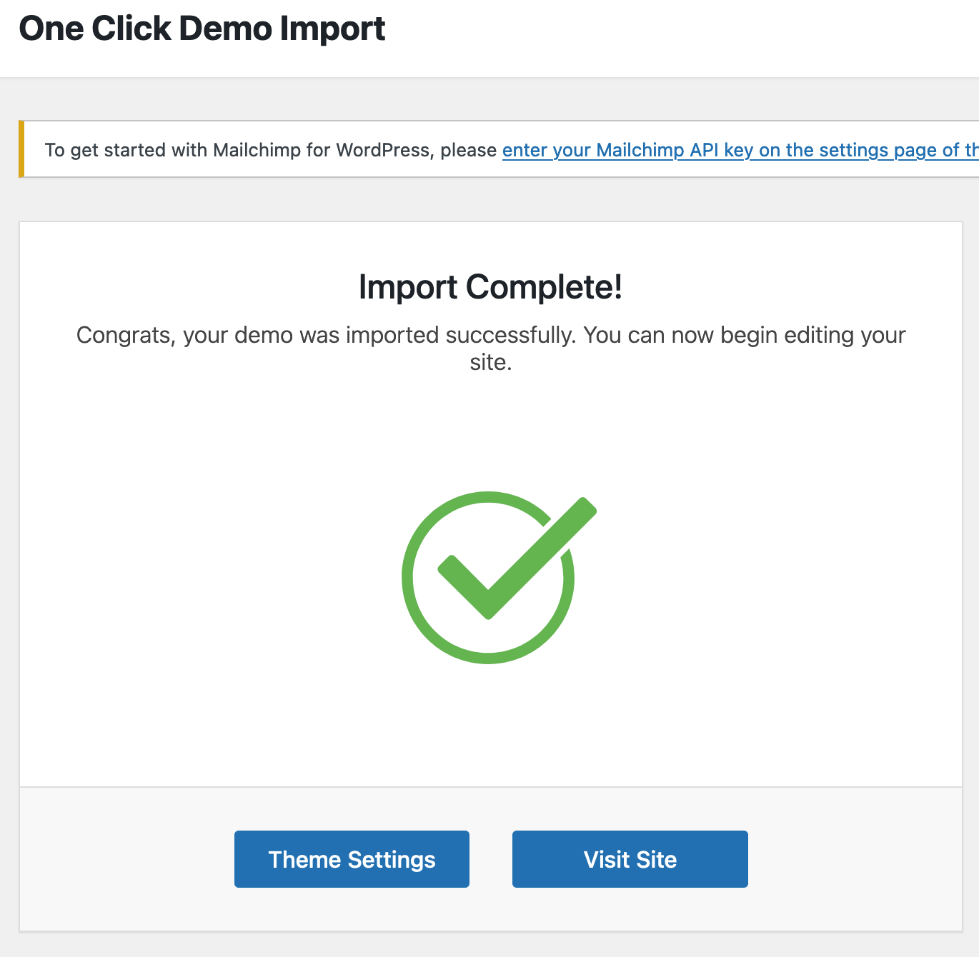 After the import is successful, you will see a white screen that says Import Complete with a checkmark. Repeat these steps for as many theme pages and templates as you would like to add to your site.