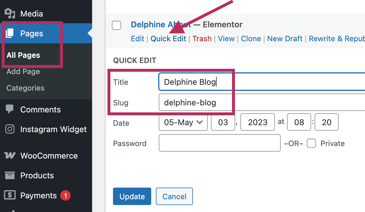 To easily edit the Page Title and Page Slug, I recommend using the Quick Edit link. As shown in the screenshot below, visit the Pages section of the Dashboard. There is a Quick Edit link below each page. After you have made any changes in the Quick Edit options, click the blue Update button to save the changes.