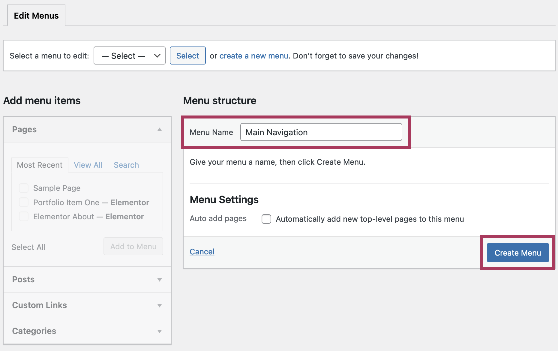 On the next screen, use the Menu Name textbox to give your new menu a unique name. Click the blue Create Menu button to create a new menu on your site.