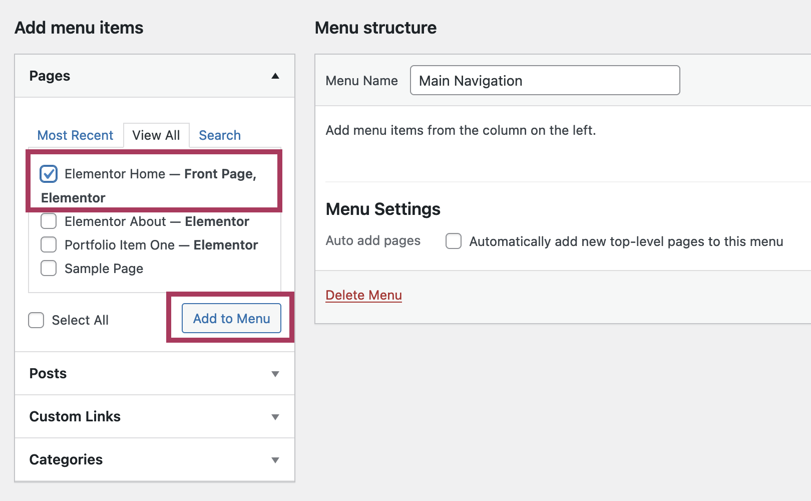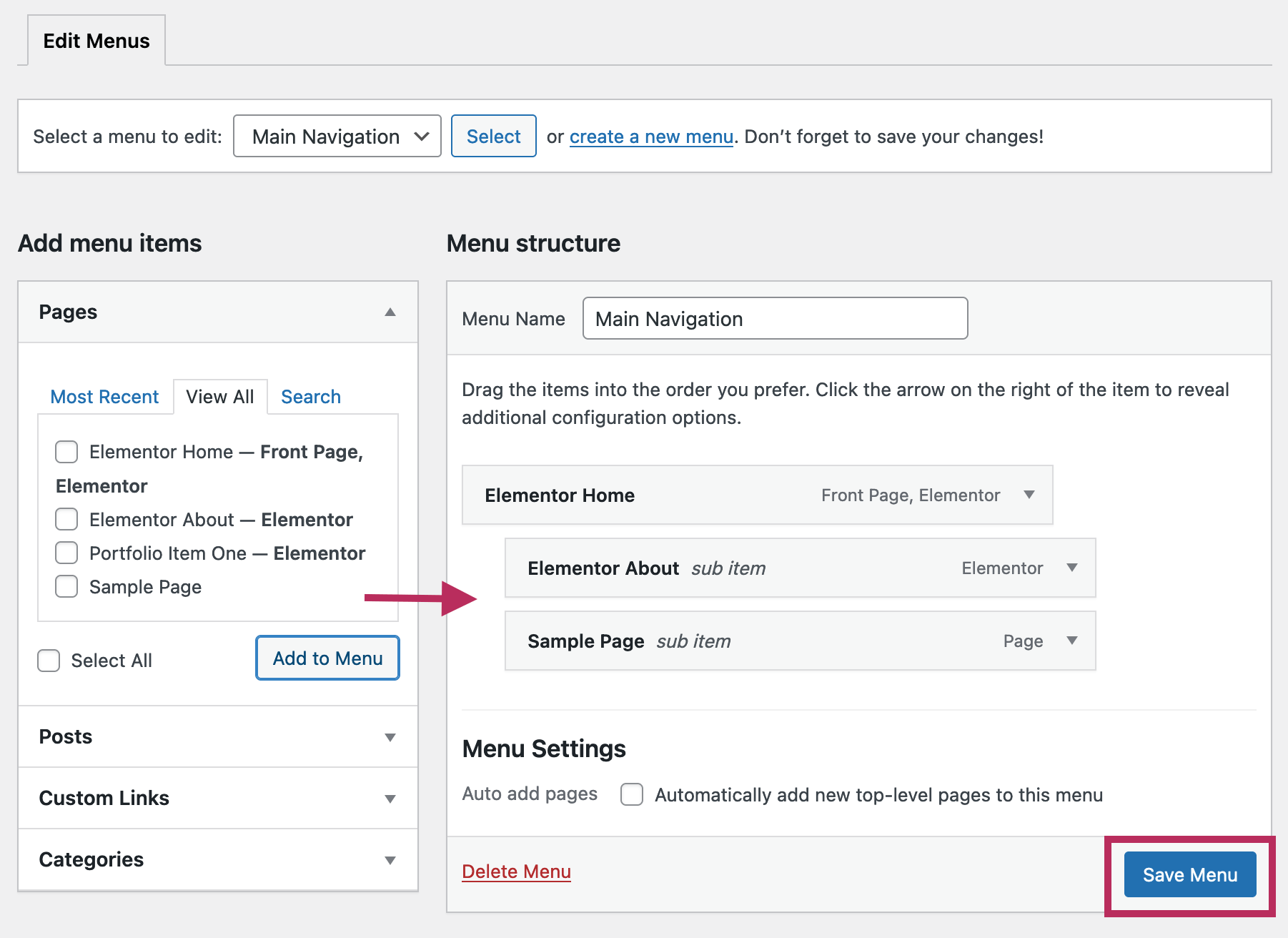 To add a link to the navigation menu, check the box next to the page name and click the Add to Menu button.