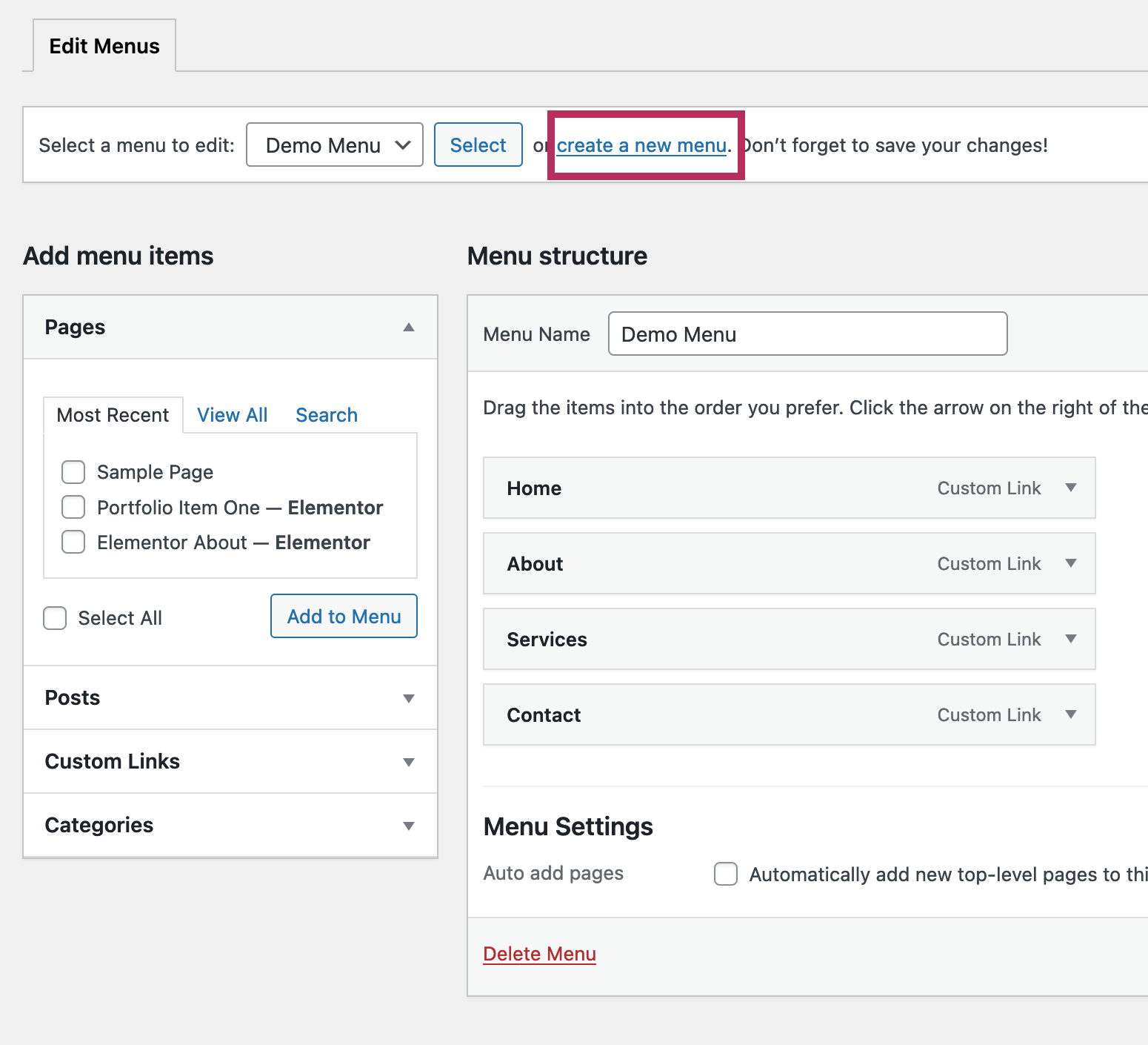 To create or edit a WordPress menu, navigate to Appearance > Menus. If this is a new website, you can create a new menu by clicking the create a new menu link shown in the screenshot below.