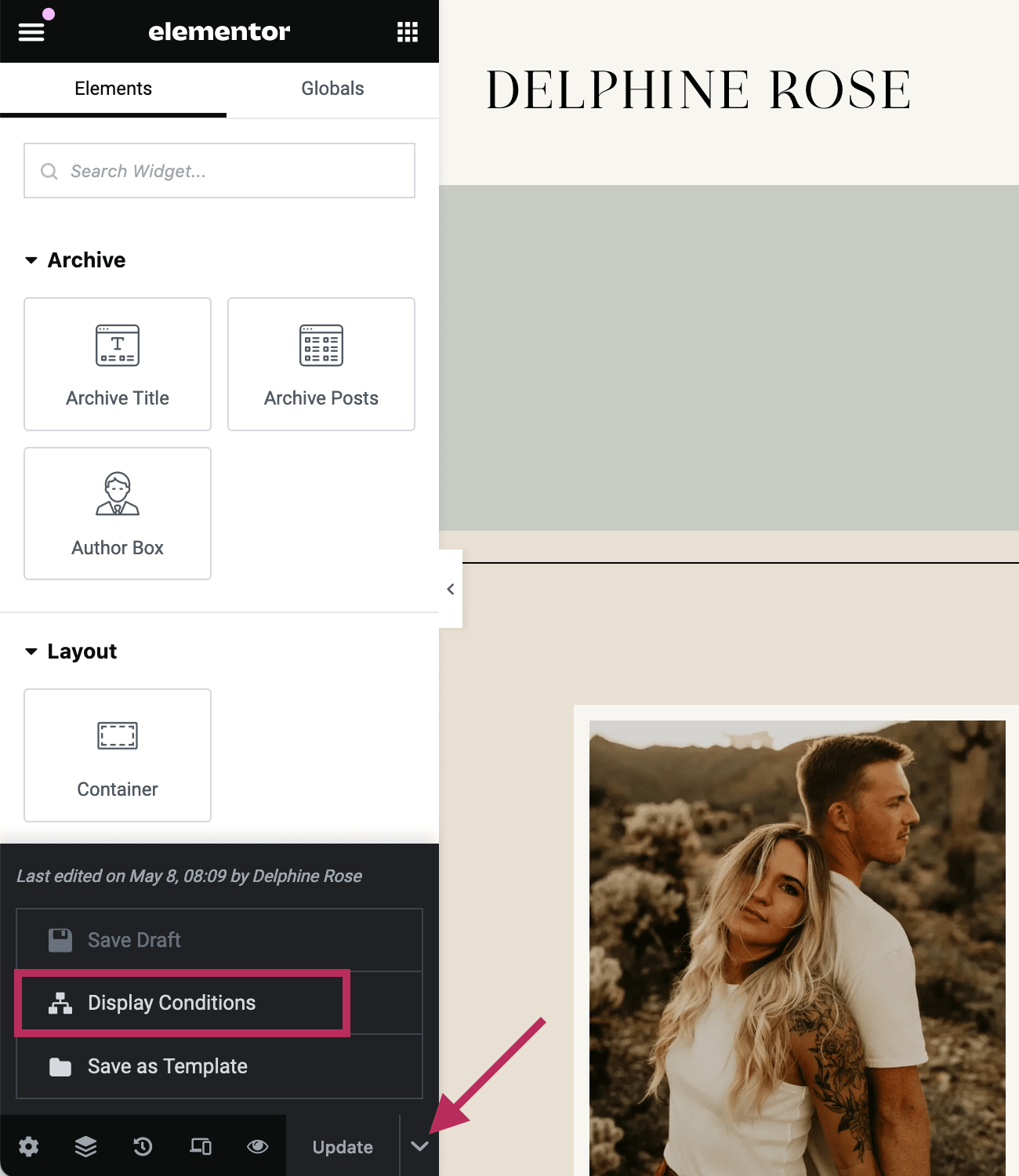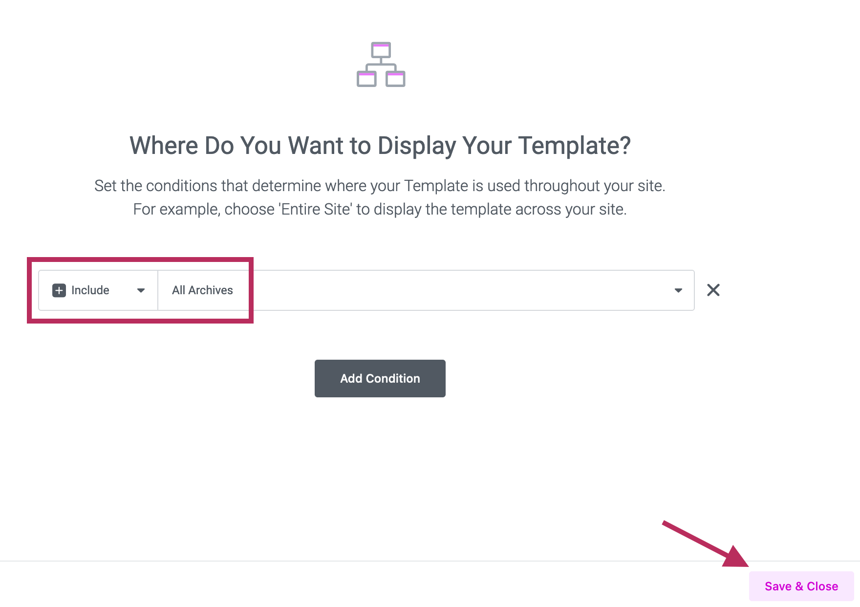 Whenever you are finished making changes to the Archive Template, click the small triangle icon next to the Update button. Click on Display Conditions. On the pop-up screen that appears, please sure the template is set to display on All Archives. Click the Save & Close to save all changes for the Archive template.
