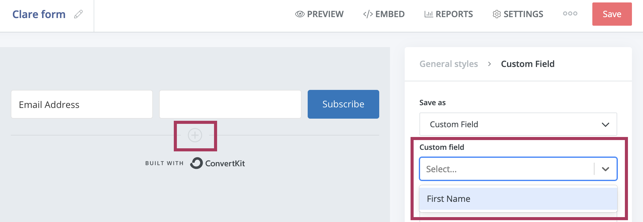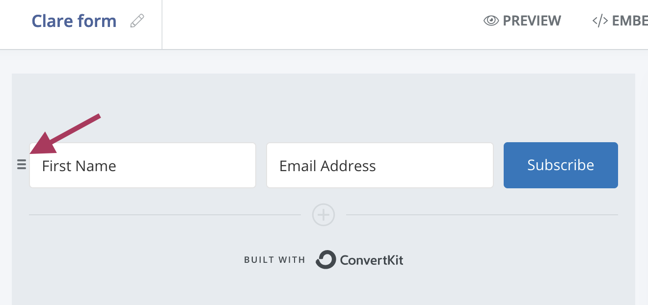 On the next screen, use the ConvertKit form builder to customize the Clare template to your preferences. First, you can select the "+" icon to add a name field to the form.