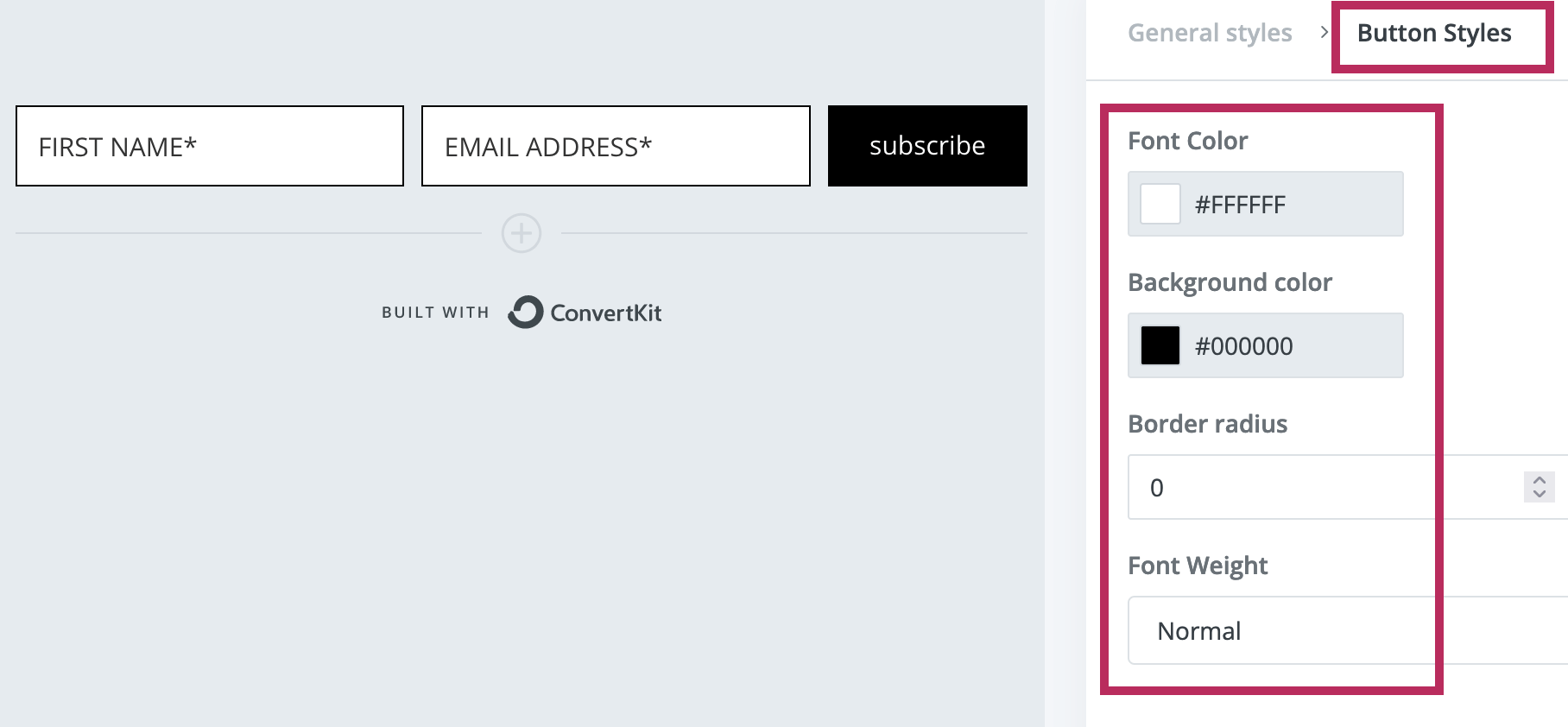 The screenshots below show the recommended style settings for your Convertkit form. These are the styles that will best match with the rest of the Delphine theme. Feel free to update the colors to match your own personal brand.