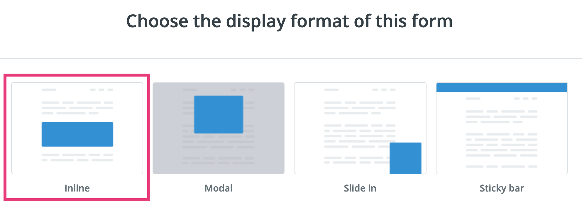 Within the "Landing Pages & Forms" section of your ConvertKit account, click the "Create New" button and then the "Form" button to create a new subscription form. When prompted to choose the display format, select "Inline" as shown in the screenshot below.
