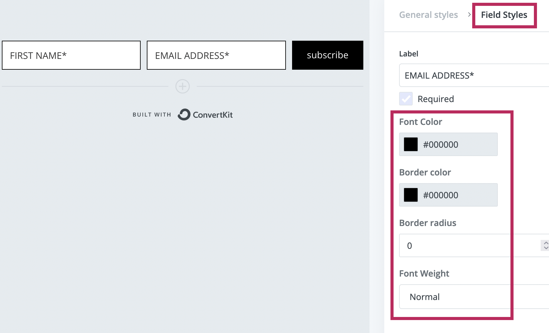 The screenshots below show the recommended style settings for your Convertkit form. These are the styles that will best match with the rest of the Delphine theme. Feel free to update the colors and fonts to match your own personal brand.
