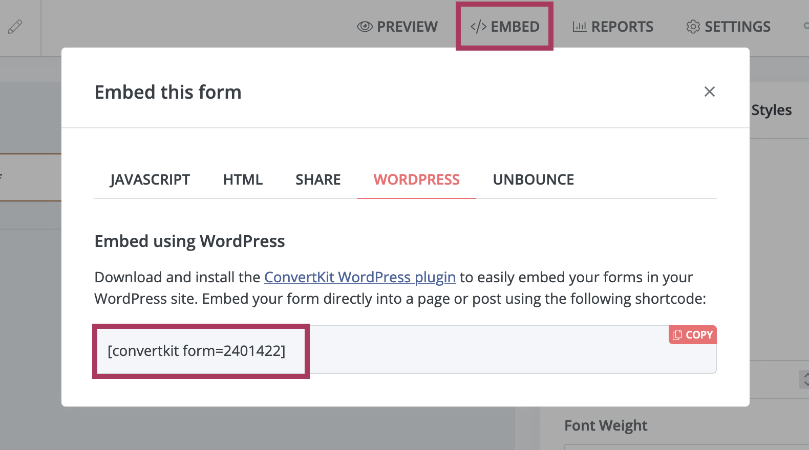 If you previously installed the ConvertKit plugin and just created a new form, you may need to refresh the plugin settings to ensure it has access to your newest form. This happens when you enter the ConvertKit shortcode in the Elementor shortcode widget / Delphine Page Settings, and the form does not appear right away.