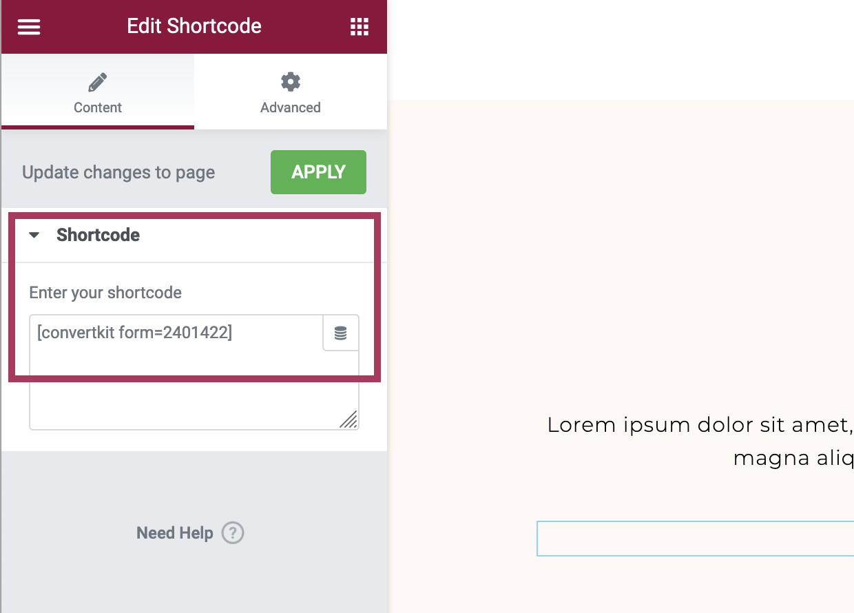 Although the default email marketing form included with the theme is a MailChimp form, you can easily switch to ConvertKit. Following the steps below, use the Elementor shortocde widget to insert a Convertkit form into any Elementor page or template.