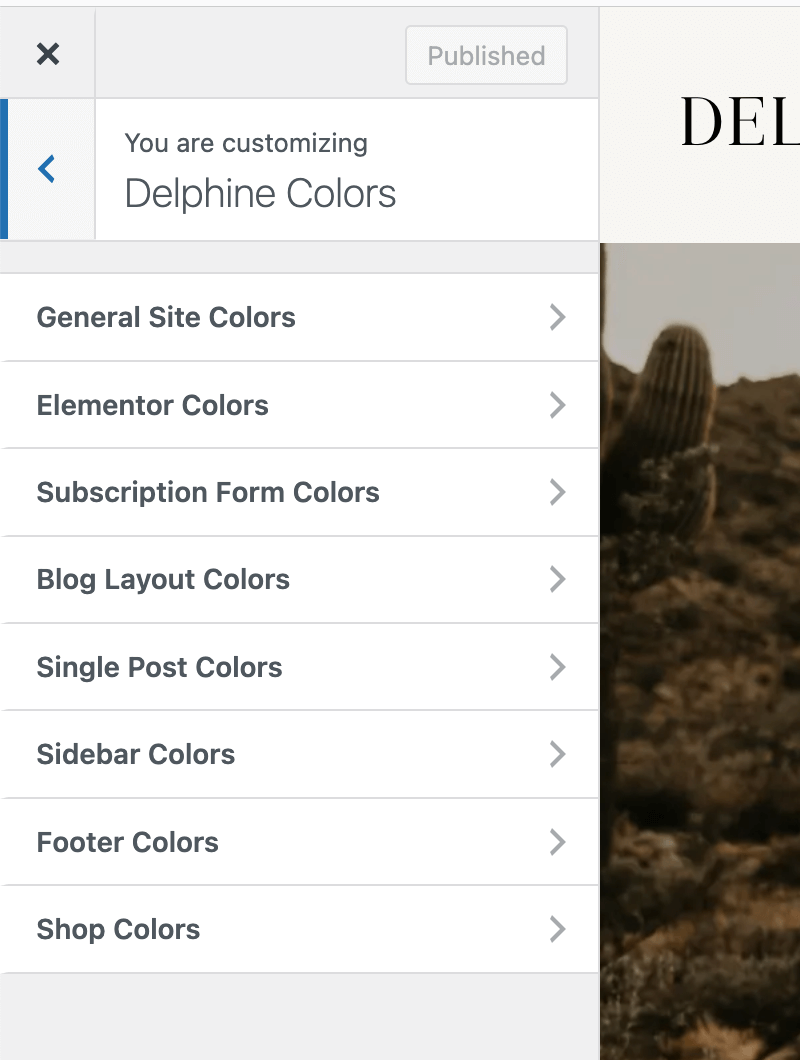To customize the colors in the theme, click on the "Delphine Colors" section. You can change theme colors for the following sections:
