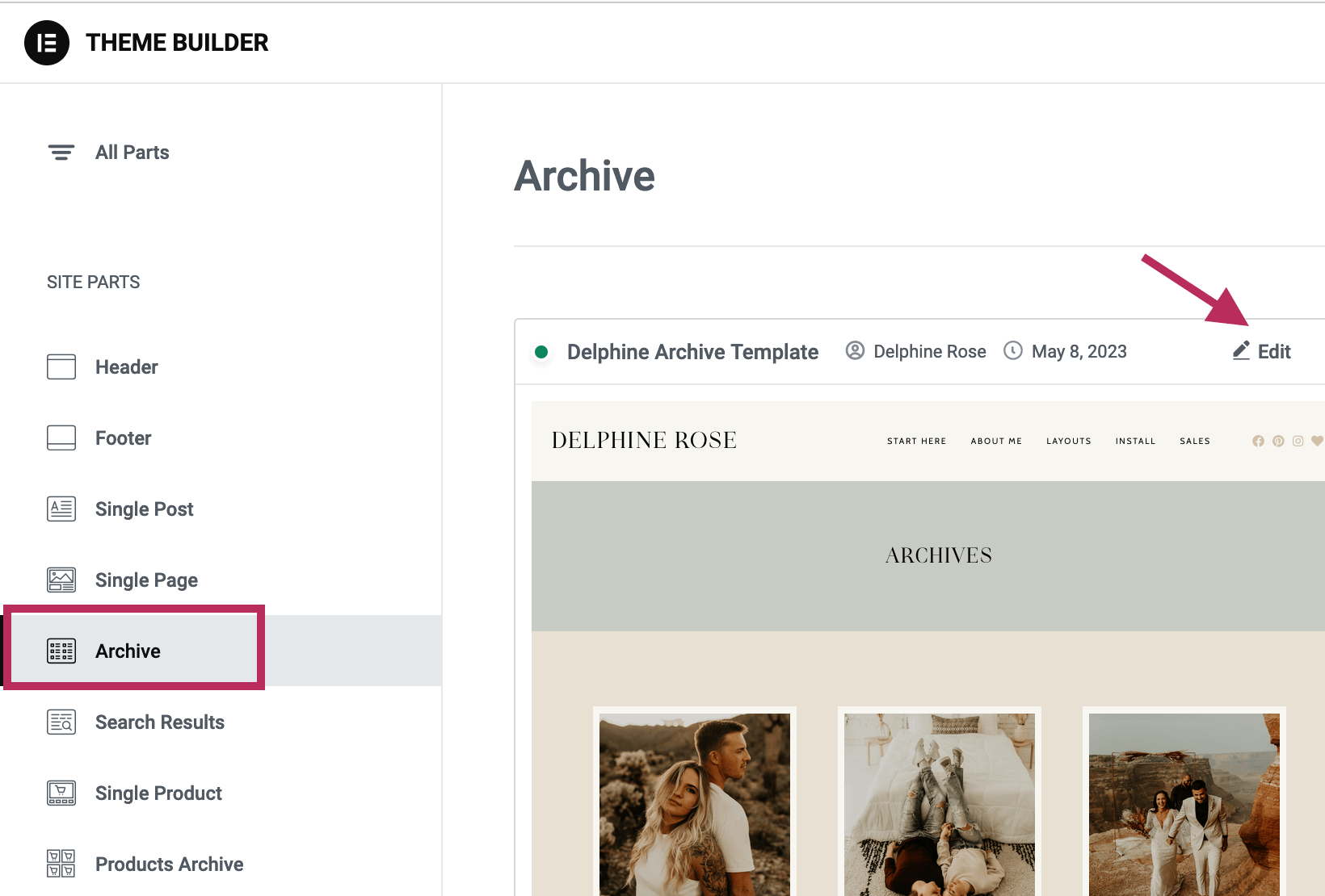 To finalize the import of the templates, navigate to Templates > Theme Builder. Locate the Delphine Header Template. Click on the Edit Conditions link.