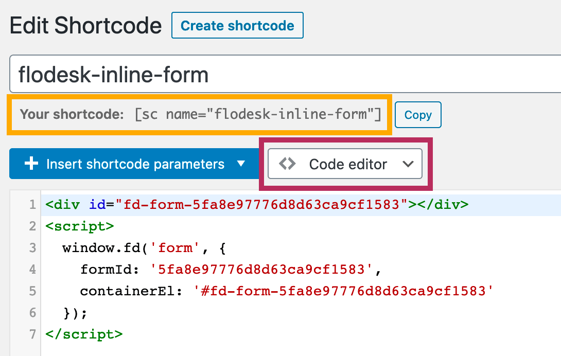 After activating the plugin, go to Shortcoder > Create shortcode. As shown in the screenshot below, make sure you are using the Code editor. Paste the Flodesk inline HTML code into the Code editor. Add a custom name and shortcode within the shortcode settings. Please take note of the Flodesk shortocde. This is how the form will be added to your Elementor pages.