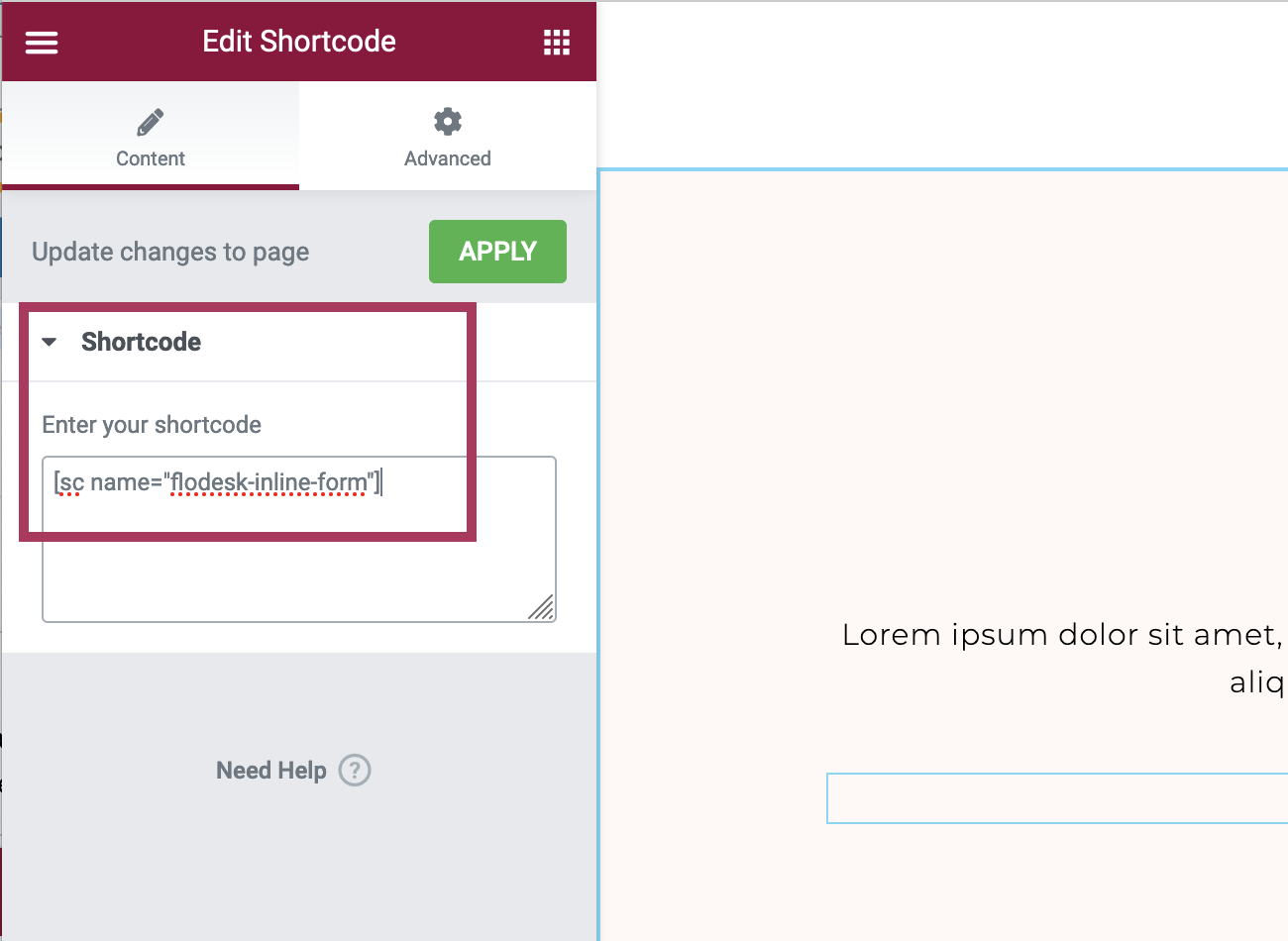 When you are editing an Elementor page or template, enter the Flodesk shortcode into the Elementor shortcode widget settings. An example is shown in the screenshot below.