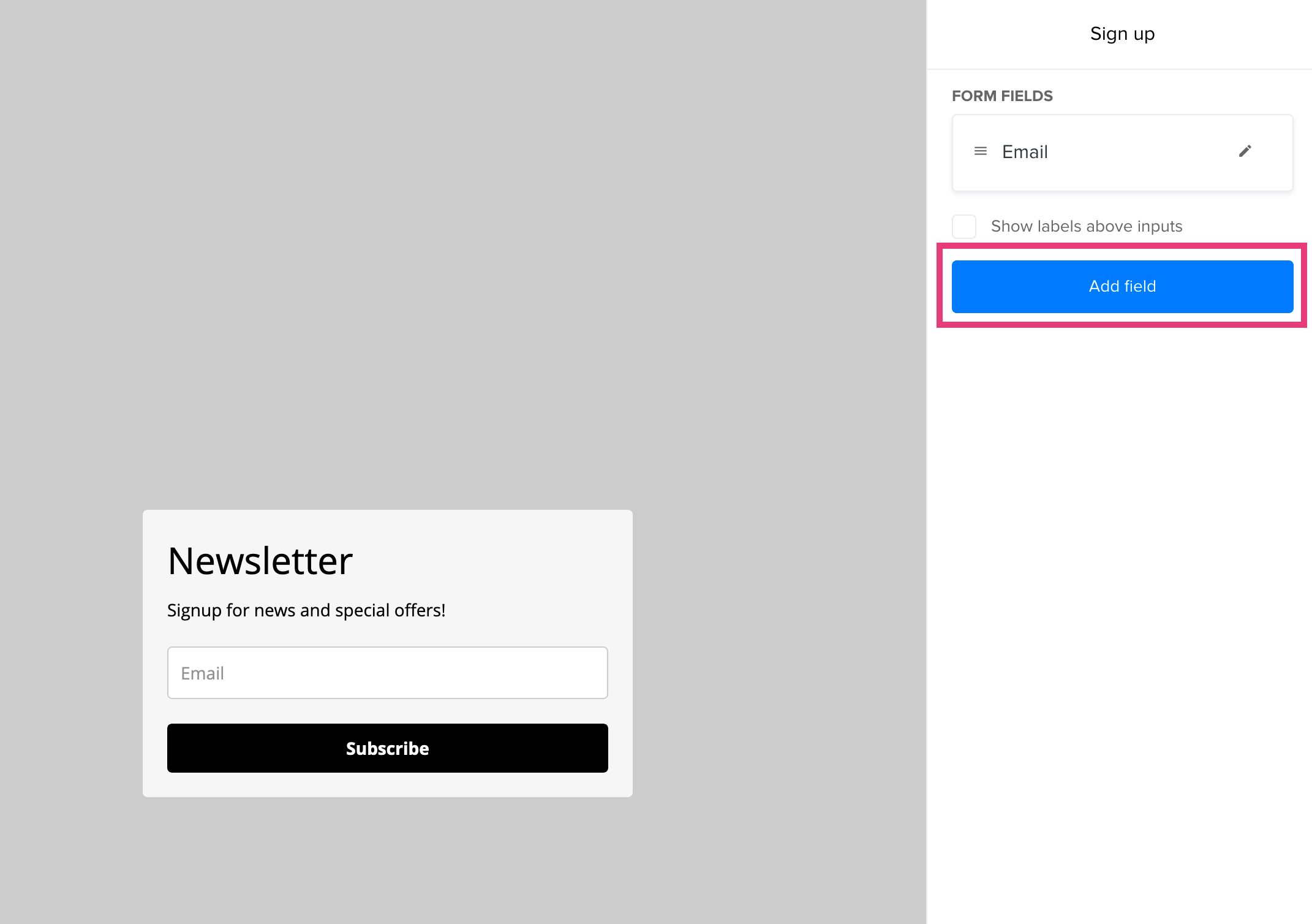 Using the settings menu on the right of the screen, click the Add field button to add a Name field to the form.