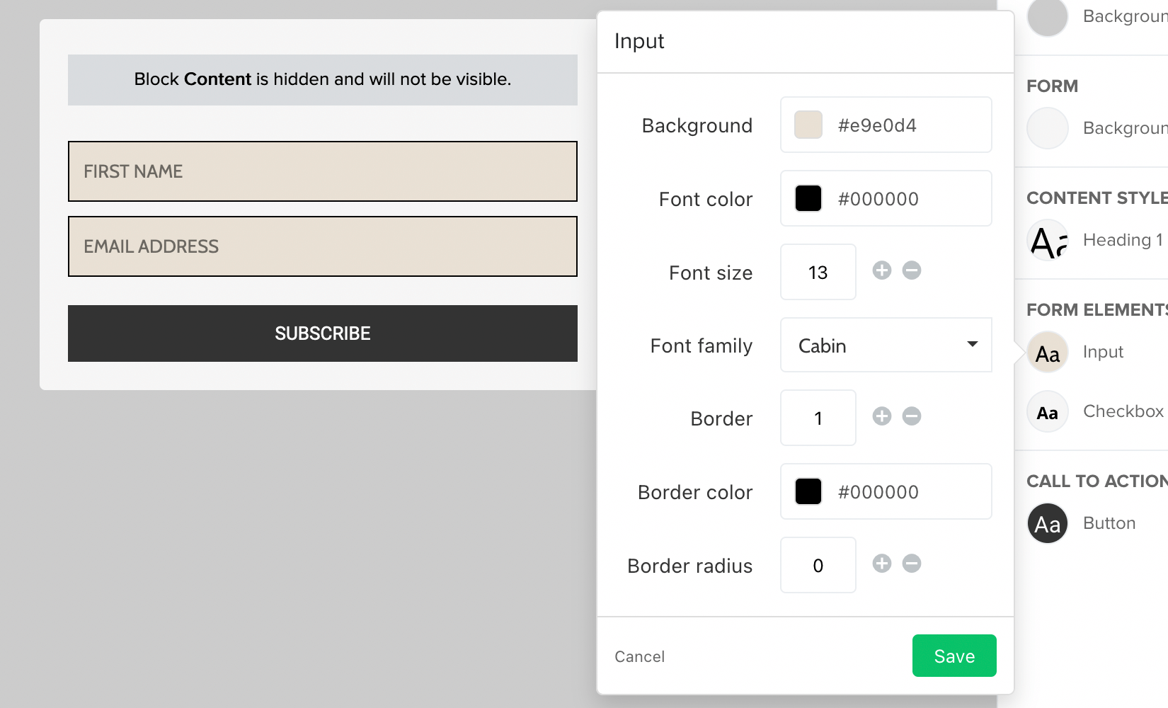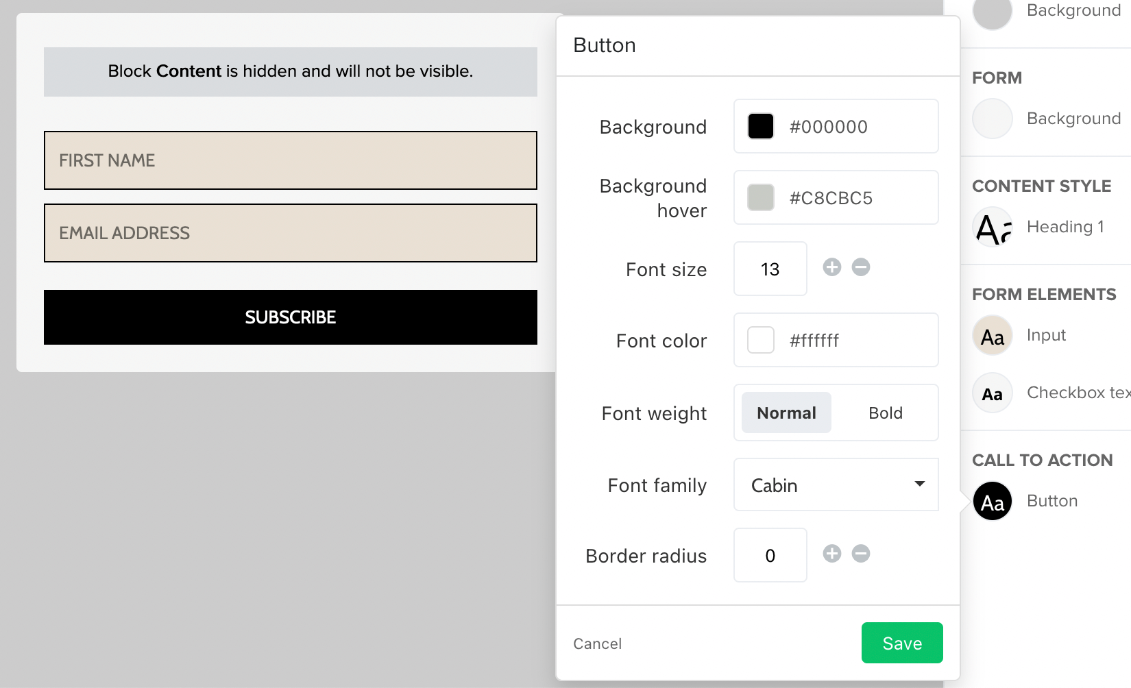 The first screenshot shows the style used for the input fields (first name and email address). The second screenshot shows the style used for the subscribe button.