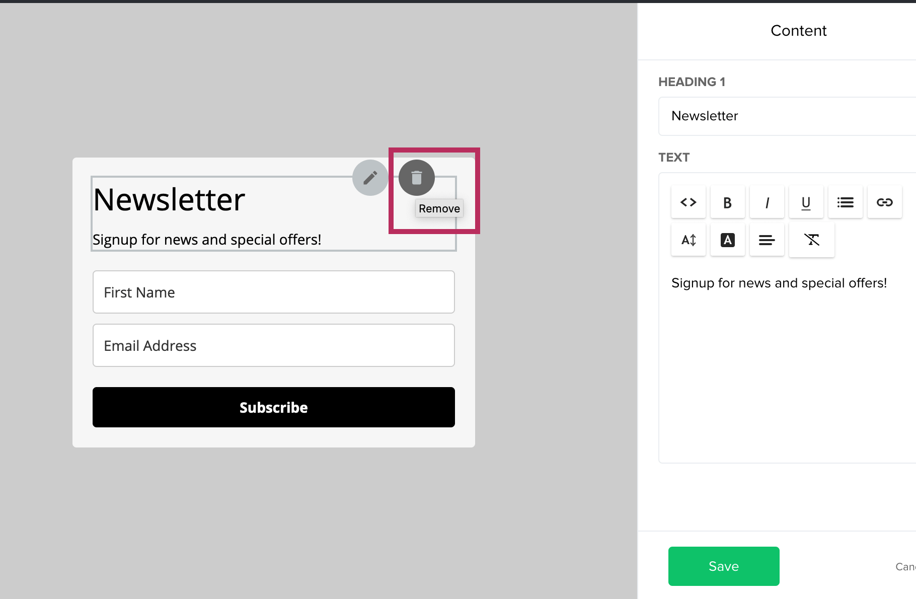 Additionally, all text (above the subscription form) is added to the page via Elementor. You do not need to use the MailerLite form builder to add text with the form. If you hover over the form text, you can click on the trash icon to remove the text.