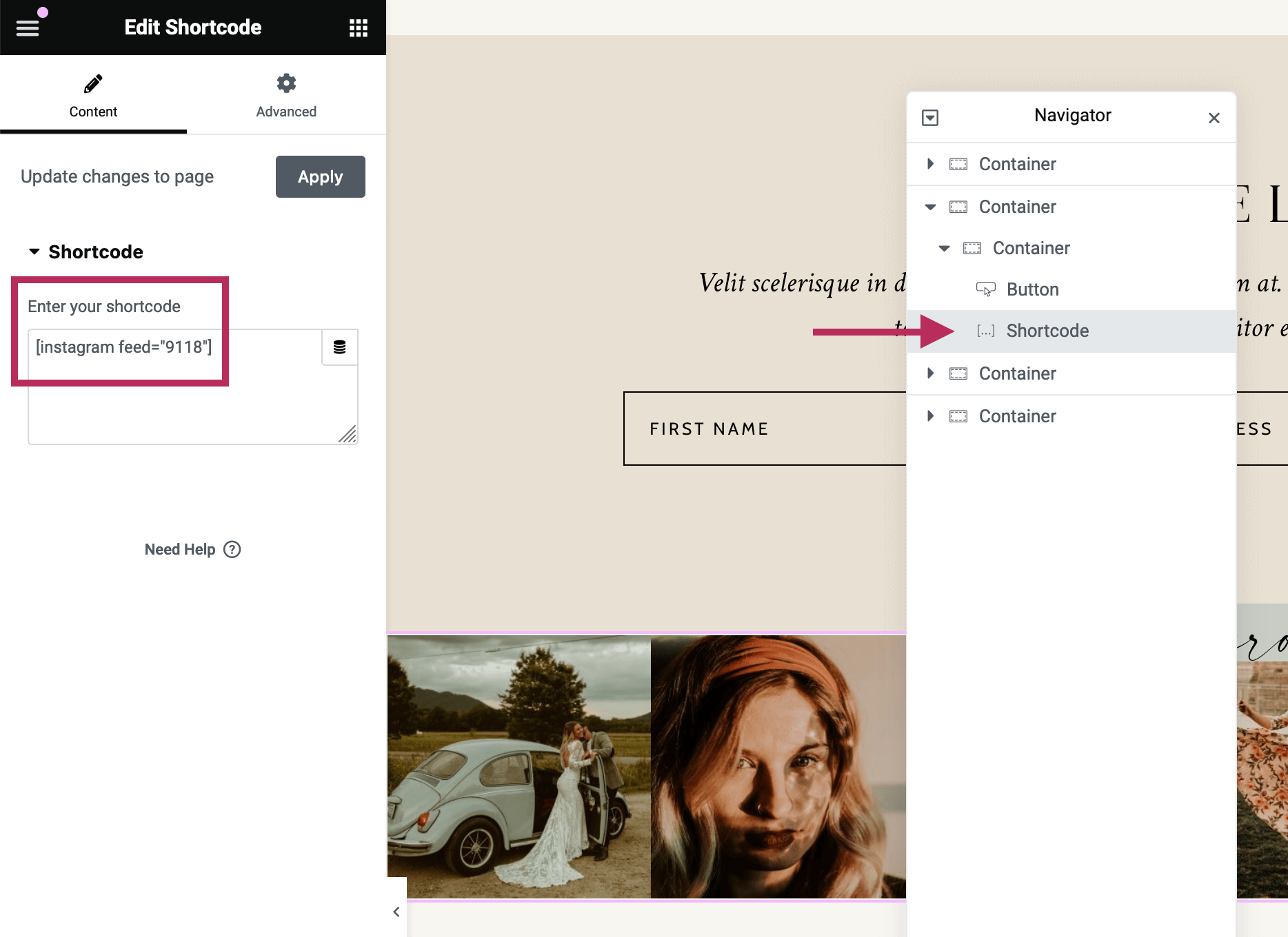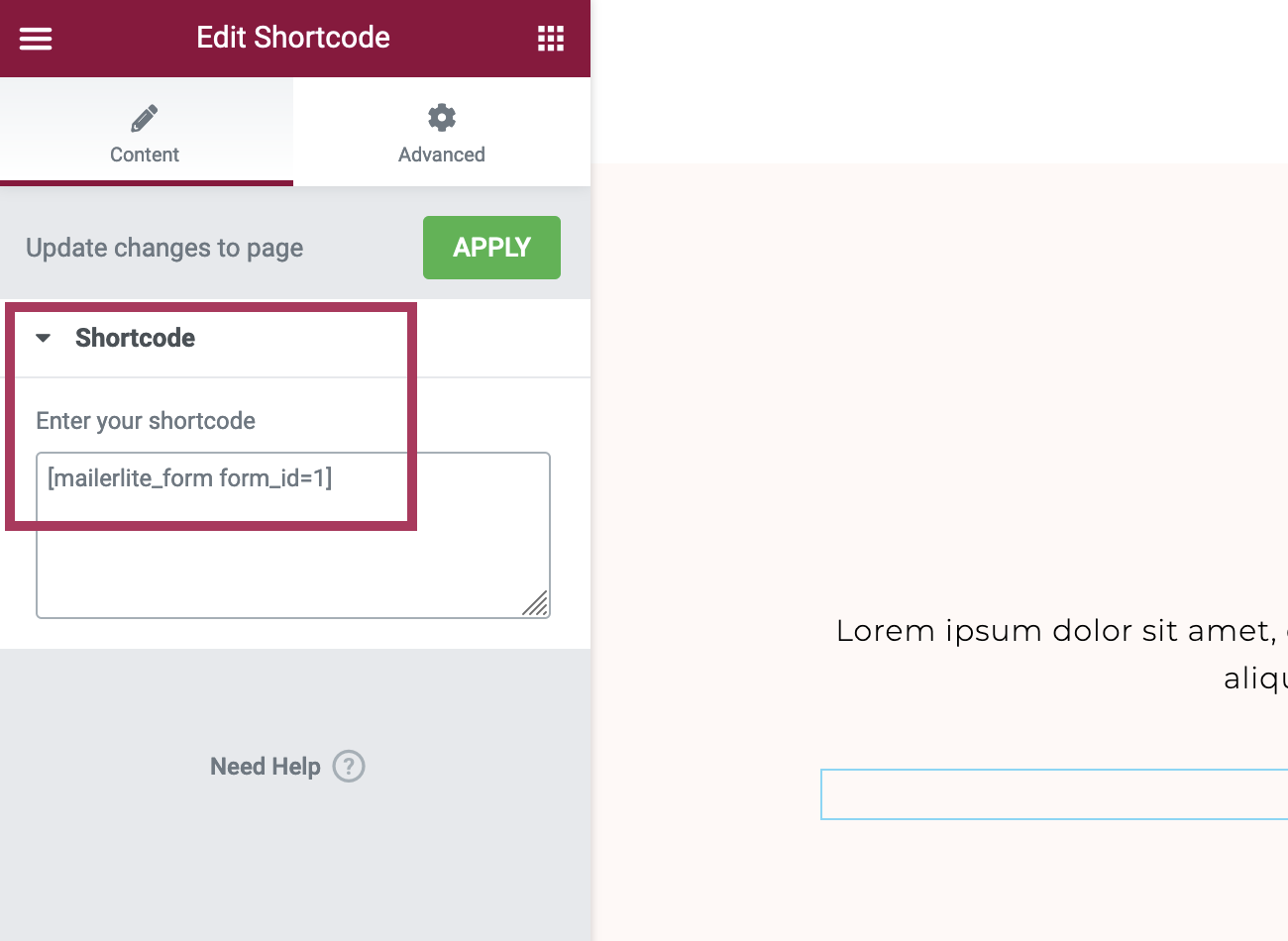 When you are editing an Elementor page, enter the MailerLite shortcode into the Elementor shortcode widget settings. An example is shown in the screenshot below.