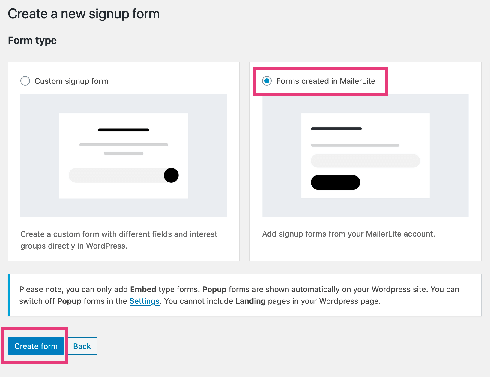 After creating the subscription form in your MailerLite account, navigate back to the WordPress Dashboard and go to MailerLite > Signup forms. Click the "Add New" button at the top of the screen. As shown in the screenshot below, select "Forms created in MailerLite" and then click the Create form button.
