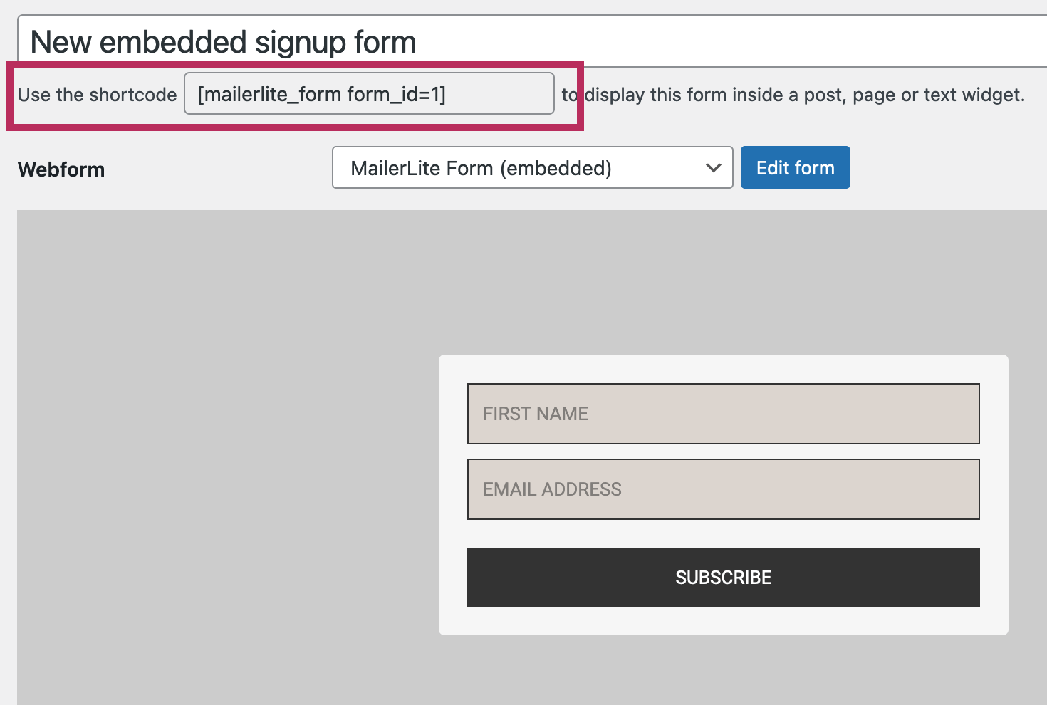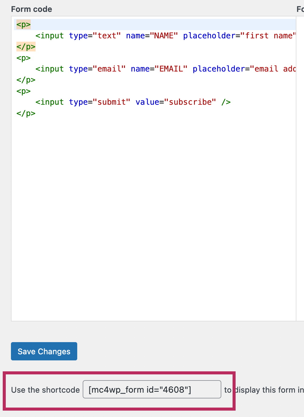 If you still need the form code, copy the code below and paste it into "Form code" box to replace the default plugin code. Click Save Changes to update your subscribe form.