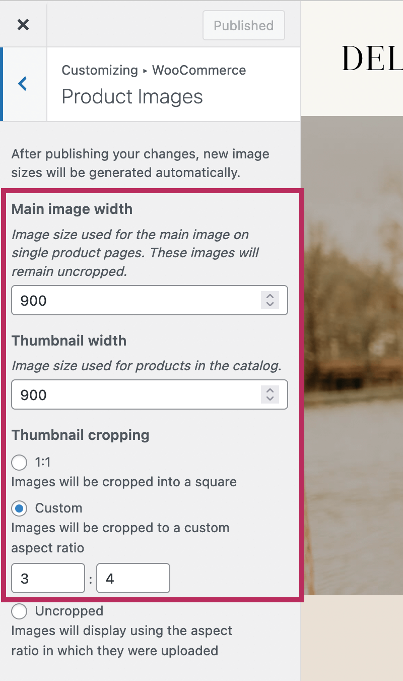 You can also use the Thumbnail cropping option to update the aspect ratio of your product images. By default, WooCommerce crops all product images to a 1:1 square. However, you can use this setting to update the aspect ratio to better fit your products.